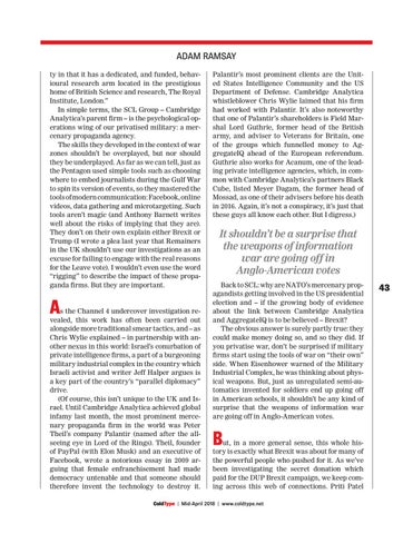 Adam Ramsay ty in that it has a dedicated, and funded, behavioural research arm located in the prestigious home of British Science and research, The Royal Institute, London.” In simple terms, the SCL Group – Cambridge Analytica’s parent firm – is the psychological operations wing of our privatised military: a mercenary propaganda agency. The skills they developed in the context of war zones shouldn’t be overplayed, but nor should they be underplayed. As far as we can tell, just as the Pentagon used simple tools such as choosing where to embed journalists during the Gulf War to spin its version of events, so they mastered the tools of modern communication: Facebook, online videos, data gathering and microtargeting. Such tools aren’t magic (and Anthony Barnett writes well about the risks of implying that they are). They don’t on their own explain either Brexit or Trump (I wrote a plea last year that Remainers in the UK shouldn’t use our investigations as an excuse for failing to engage with the real reasons for the Leave vote). I wouldn’t even use the word “rigging” to describe the impact of these propaganda firms. But they are important.