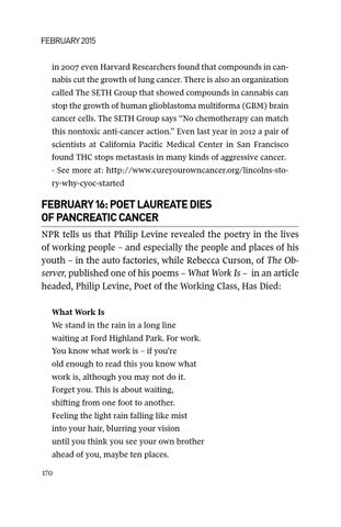 February 16: Poet Laureate Dies of Pancreatic Cancer NPR tells us that Philip Levine revealed the poetry in the lives of working people – and especially the people and places of his youth – in the auto factories, while Rebecca Curson, of The Observer, published one of his poems – What Work Is – in an article headed, Philip Levine, Poet of the Working Class, Has Died: What Work Is We stand in the rain in a long line waiting at Ford Highland Park. For work. You know what work is – if you’re old enough to read this you know what work is, although you may not do it. Forget you. This is about waiting, shifting from one foot to another. Feeling the light rain falling like mist into your hair, blurring your vision until you think you see your own brother ahead of you, maybe ten places. 170
