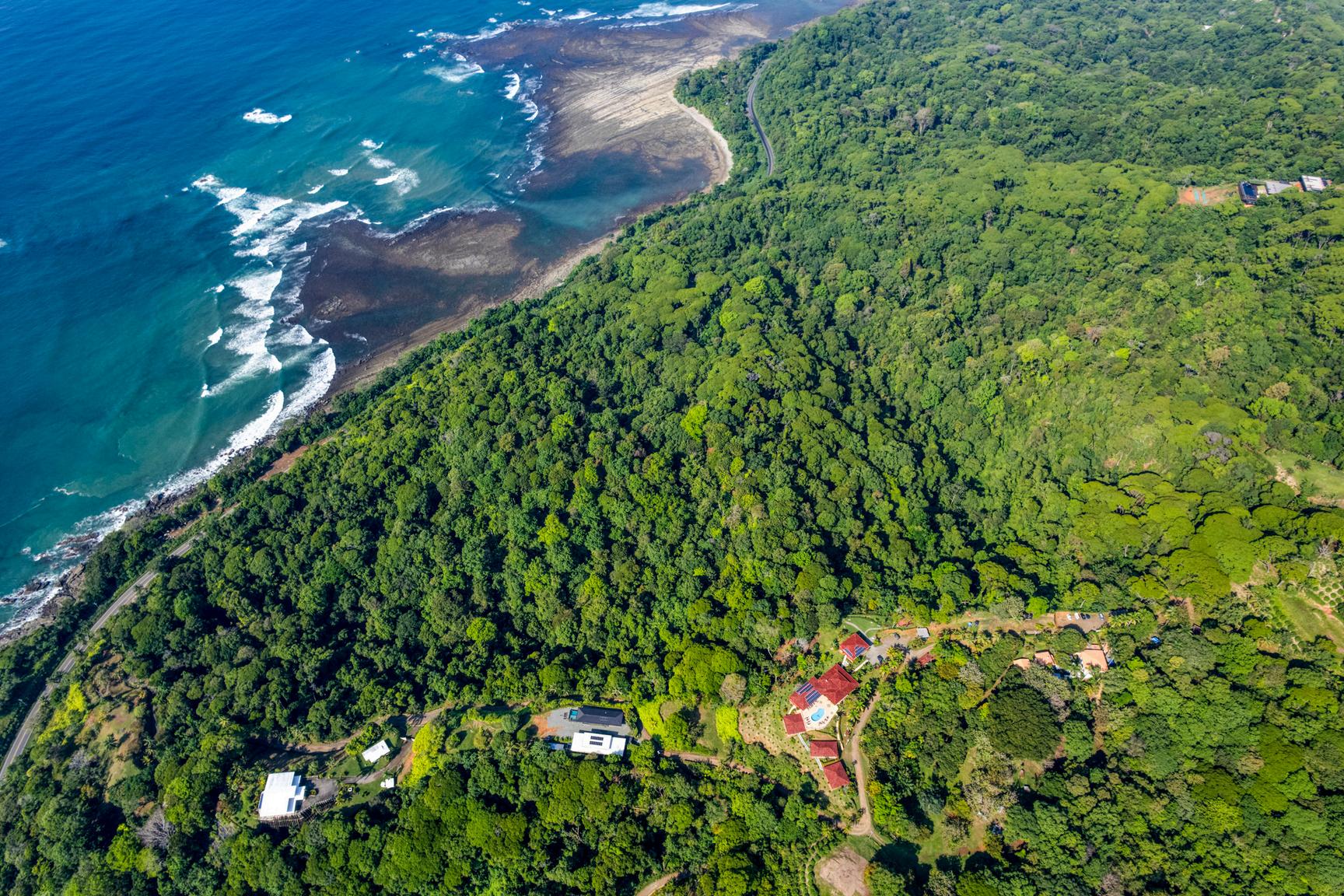 The property features elevated terrain with a natural plateau offering expansive Pacific Ocean views, gradually descending into protected rainforest This topography allows for a flexible, low-density master plan that preserves view corridors while integrating seamlessly with the surrounding environment