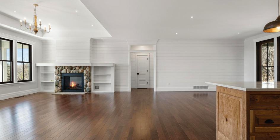 Stunning four-bed, three and half bath home in sought-after Shangri La nestled on a private acre cul-de-sac lot backed by acres of woods. Features a grand two story great room, gourmet kitchen with granite/maple cabinetry, 1st- oor master suite, and one of the best nished walkout basements around, complete with bar, replace, full bath, and workshop. Huge porch, three car garage, premium nishes!