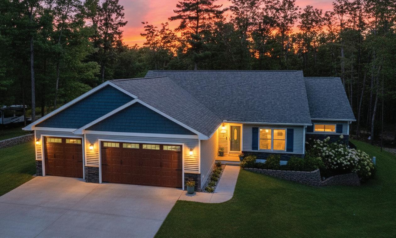 Stunning four-bed, three and half bath home in sought-after Shangri La nestled on a private acre cul-de-sac lot backed by acres of woods. Features a grand two story great room, gourmet kitchen with granite/maple cabinetry, 1st- oor master suite, and one of the best nished walkout basements around, complete with bar, replace, full bath, and workshop. Huge porch, three car garage, premium nishes!