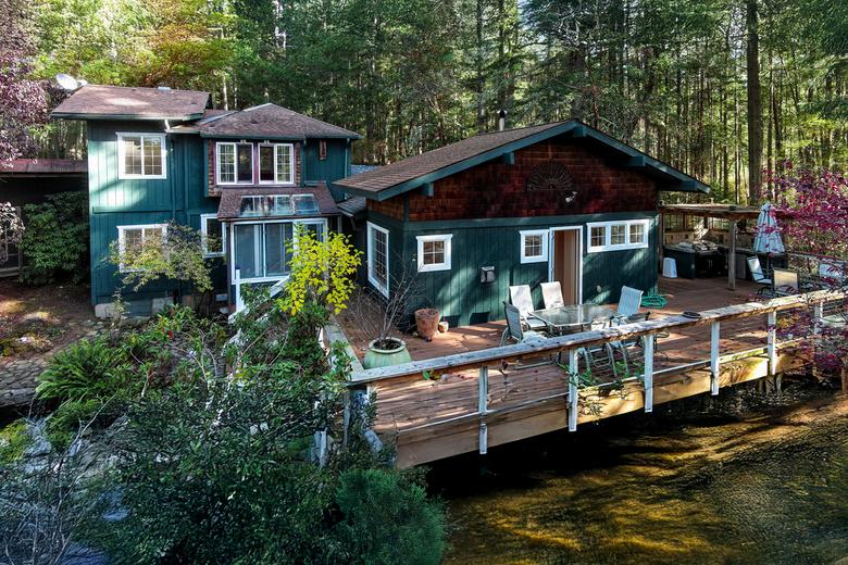 Tucked away on approx 9.5 private acres, this charming 3-bedroom, 2-bath home blends privacy with income potential. A permitted vacation rental and separate 768 sf guest cottage with its own driveway, make it ideal for multi-generational living or hosting. A popular and active Airbnb listing with many 5 star ratings, guests consistently praise its cozy, welcoming feel and the tranquil setting. Surrounded by majestic trees, the property features a serene pond, forested trails, and open spaces to explore. Recent updates, including fresh exterior paint and new decks, enhance its appeal. Whether a full-time residence, private retreat, or turn-key rental, this unique property delivers beauty, flexibility, and seclusion just minutes from town.