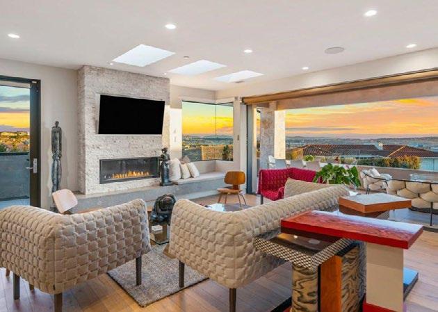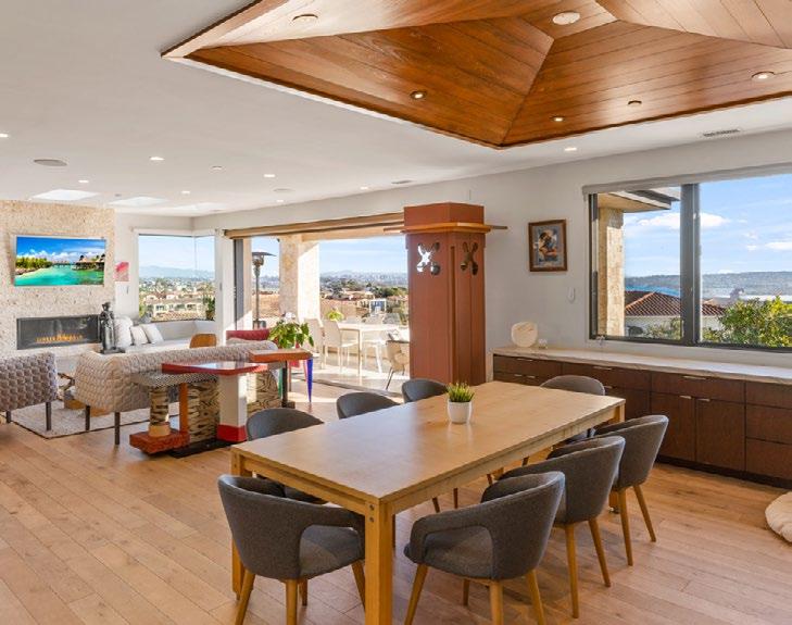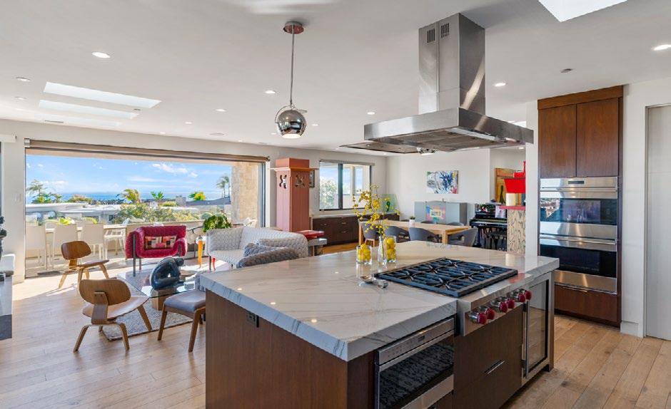 that combines the dining room, living room, and with custom mahogany built-in side cabinetry living room encourages a cozy atmosphere with its and the kitchen features the same materials used spaces together. The sizable gourmet kitchen features high-quality stainless-steel appliances modern design, including a Sub-Zero full-size fridge, a six-burner Wolf gas range with a Zephyr dishwashers, dual Wolf convection wall ovens, and a Wolf