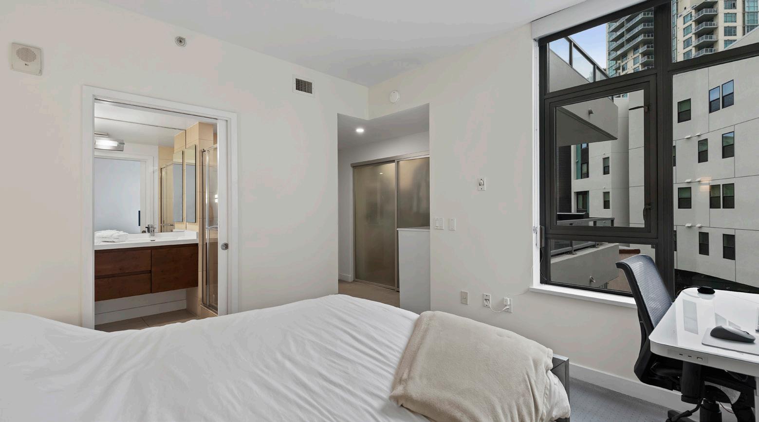Situated on the coveted northwest corner of Aria in the tranquil Cortez Hill neighborhood, this refined residence offers a seamless blend of style and function. A thoughtfully designed open floor plan showcases an updated kitchen with sleek quartz countertops highlighted by a waterfall edge, premium stainless steel appliances, generous cabinetry, and a breakfast bar for four. The light-filled living room is framed by oversized windows and opening to a spacious entertaining balcony for effortless indoor-outdoor living. With a split layout that maximizes privacy, the two primary suites are situated on opposite sides of the home—one enjoying dramatic corner windows, a walk-in closet, and a contemporary ensuite bath with dual vanities and walk-in shower, while the second offers its own ensuite retreat ideal for guests or extended stays. Additional features include motorized living-room shades, full-size in-unit laundry, and two assigned garage parking spaces. Residents of Aria indulge in resort-style amenities, from a sparkling 70-foot lap pool, spa, and stateof-the-art fitness center to a stylish resident lounge and the peace of mind of on-site management and secured FOB entry. Perfectly positioned at the edge of downtown, Aria combines the serenity of Cortez Hill with the convenience of city living—minutes to Balboa Park, Little Italy, Petco Park, the Embarcadero, and the Gaslamp Quarter, with easy access to San Diego International Airport and major freeways. This is sophisticated urban living at its finest.