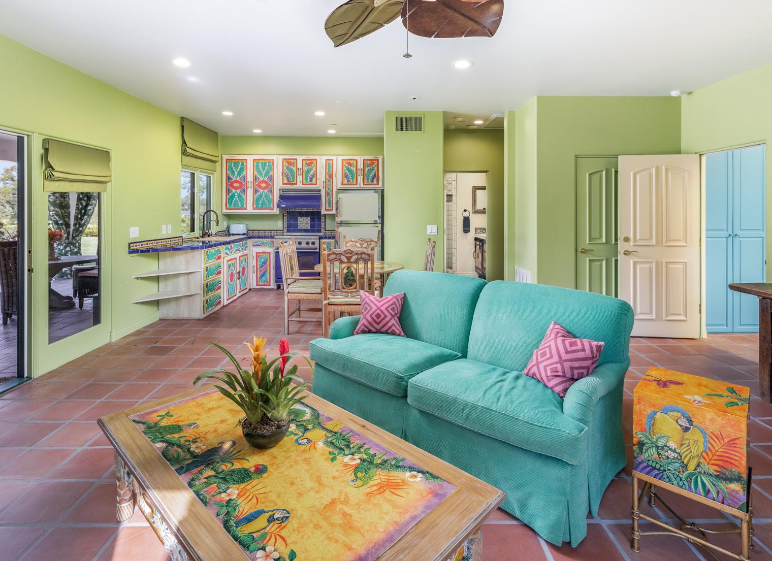 The detached over 1100 sq ft GUEST HOUSE offers 2 bedrooms, 1.5 baths, a charming California Room with an outdoor fireplace, a handpainted mural, and a sense of retreat ideal for guests, extended family, or a private studio.
