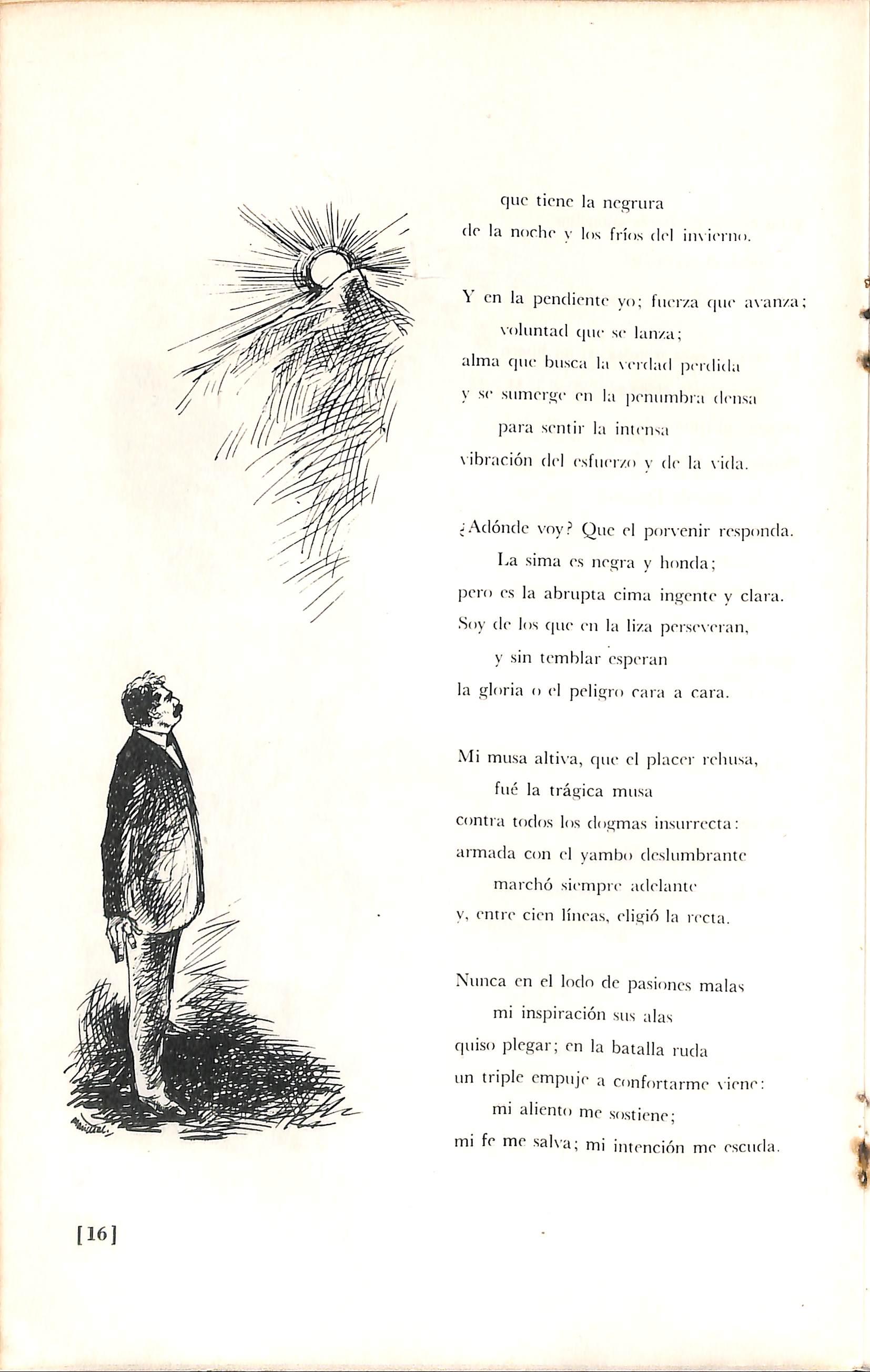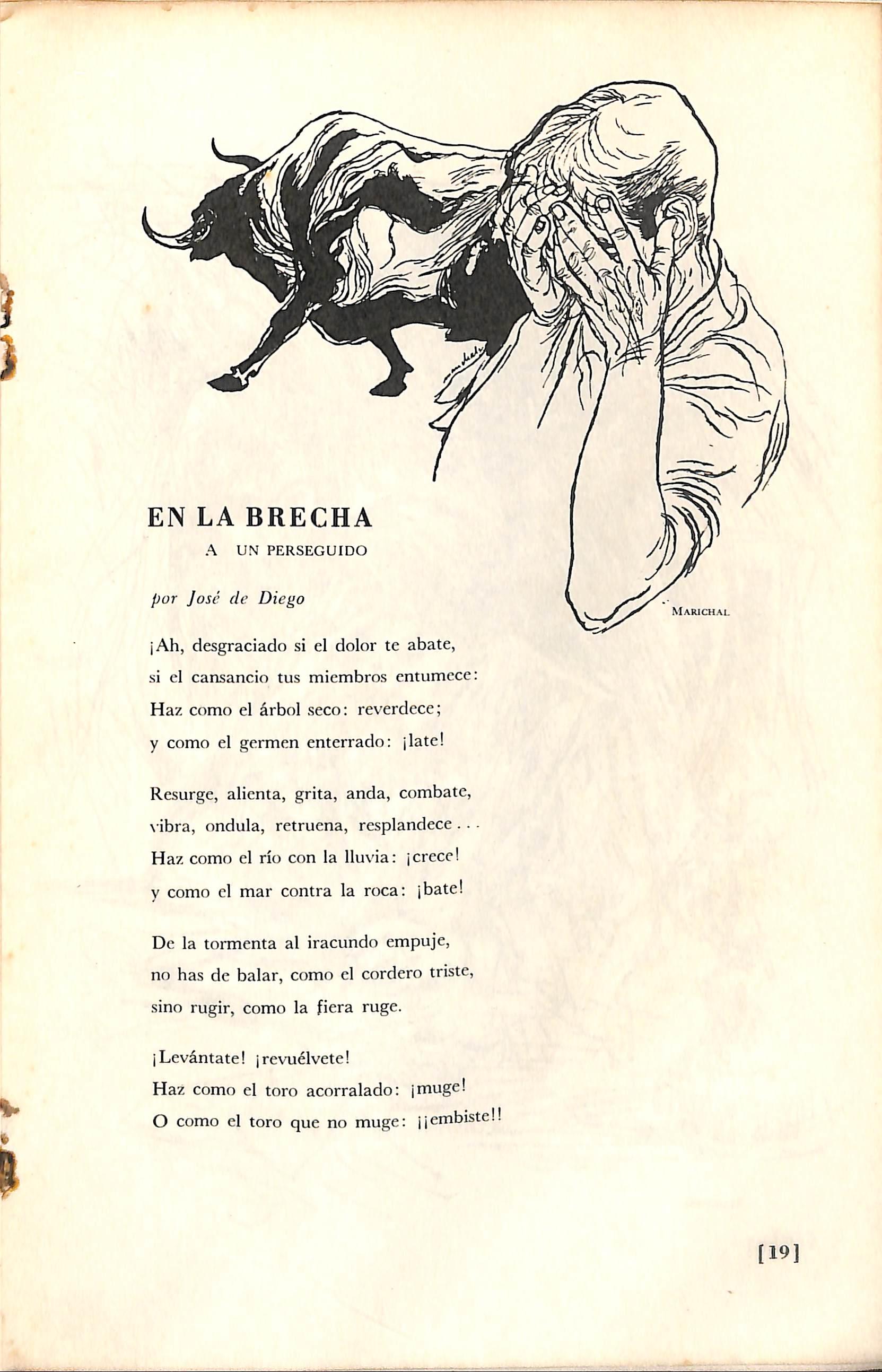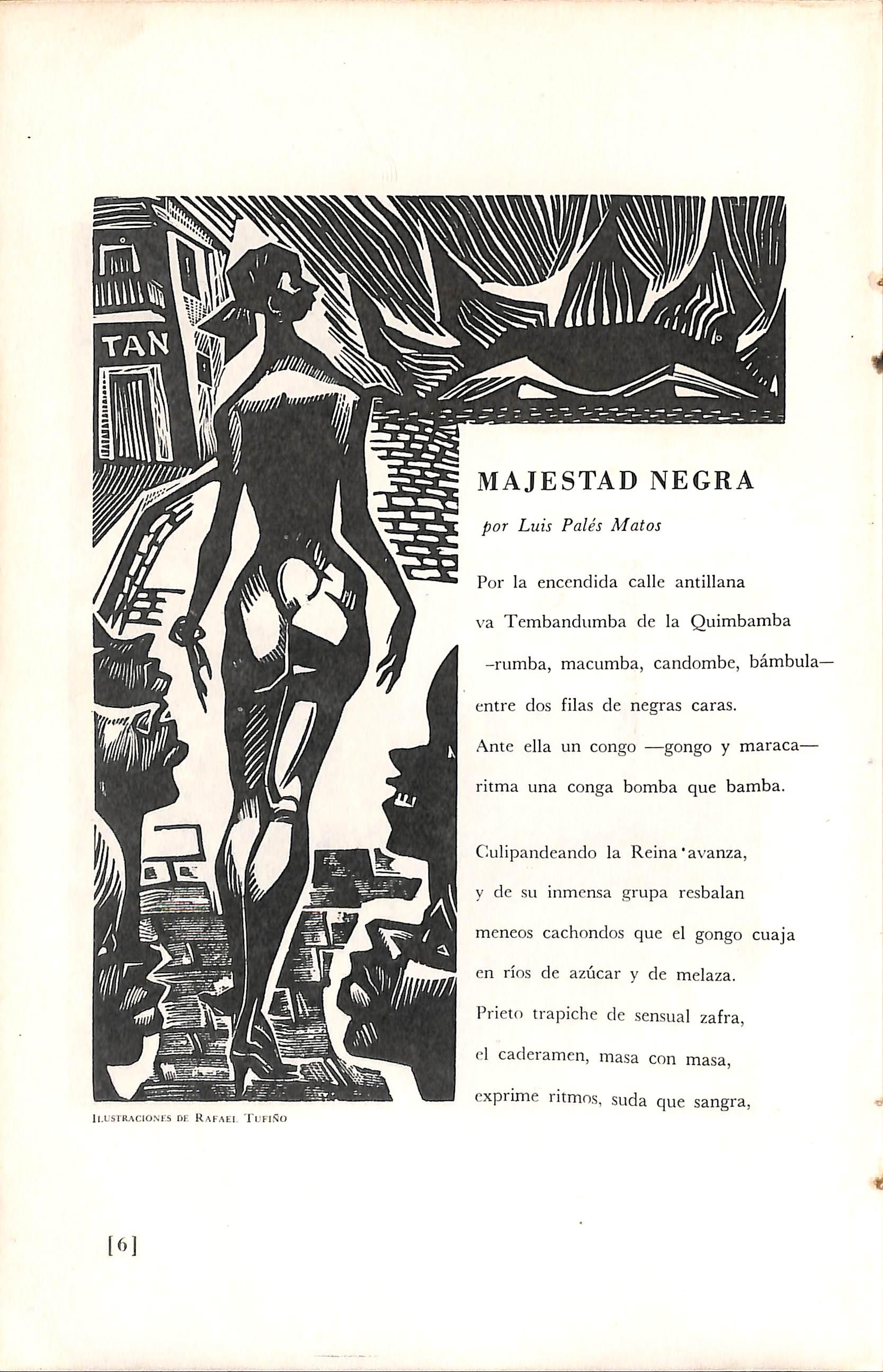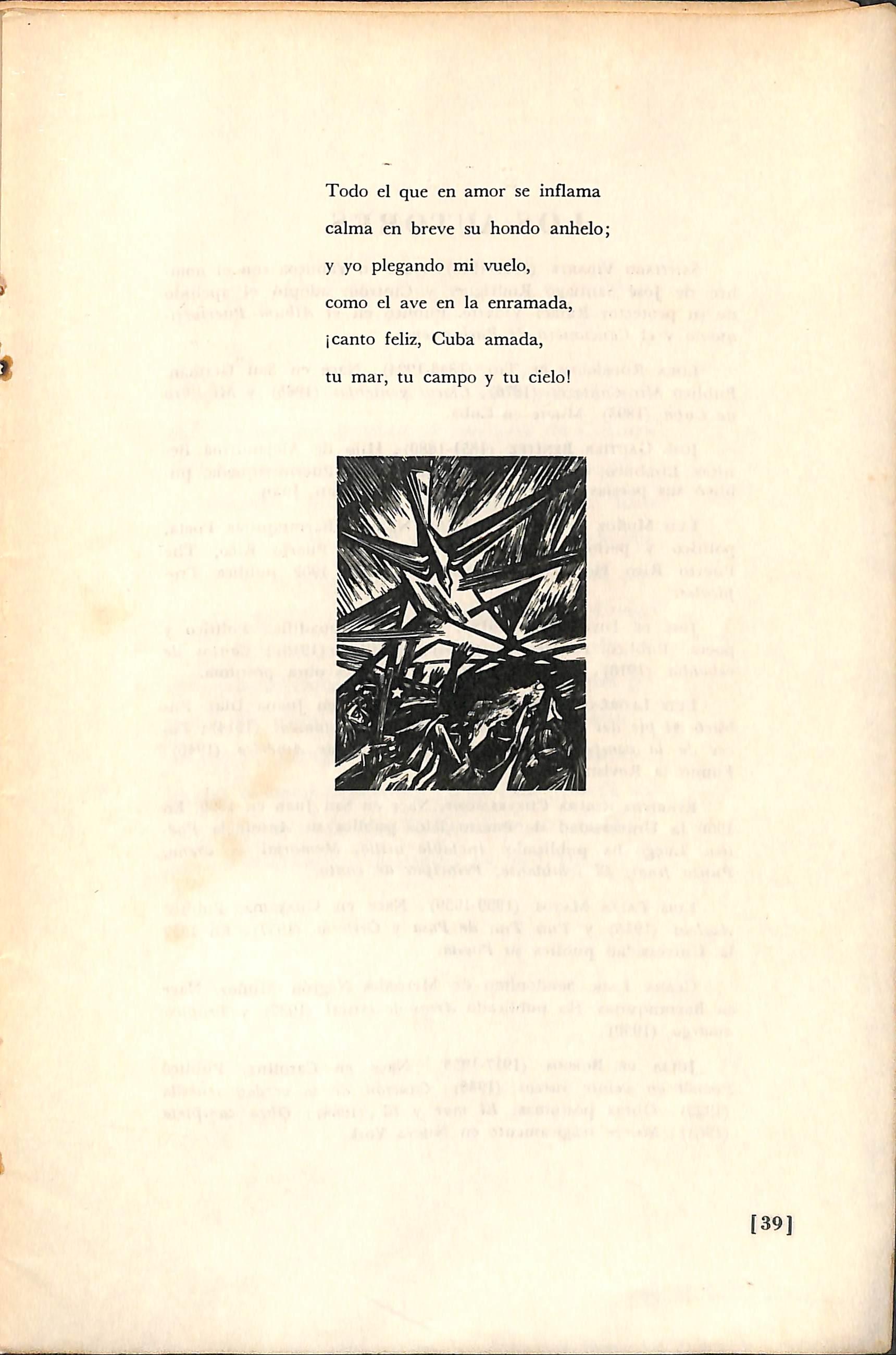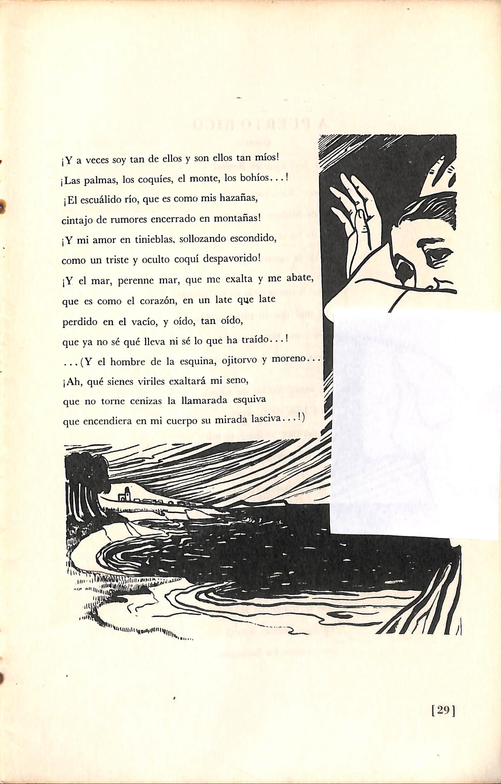 Conjuntamente, este cuaderno aspira a presentar una mues tra de nuestro arte contemporáneo, en las ilustraciones que acompañan el texto. Figuran aquí siete importantes artistas de Puerto Rico: Lorenzo Homar, Rafael Tufiño, J. A. Torres Martinó, Carlos Marichal, Augusto Marín, Samuel Sánchez y Alfonso Arana. En sus trabajos observamos la alta calidad que han al canzado el grabado y el dibujo puertorriqueños. Cumple, pues, esta breve antología un doble propósito: literario y artístico.
