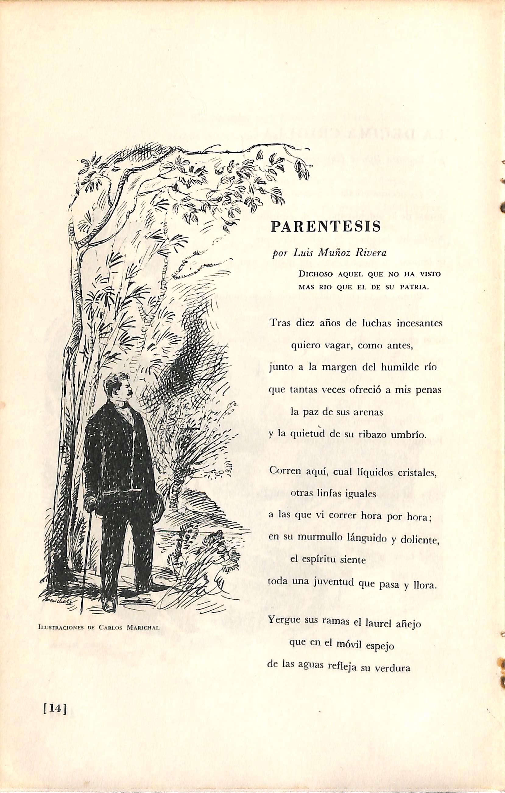 ¡Río Grande de Loíza! ... Mi manantial, mi río, desde que alzóme al mundo el pétalo materno, contigo se bajaron desde las rudas cuestas, a buscar nuevos surcos, mis pálidos anhelos; y mi niñez fue toda un poema en el río, y un no en el poema de mis primeros sueños.