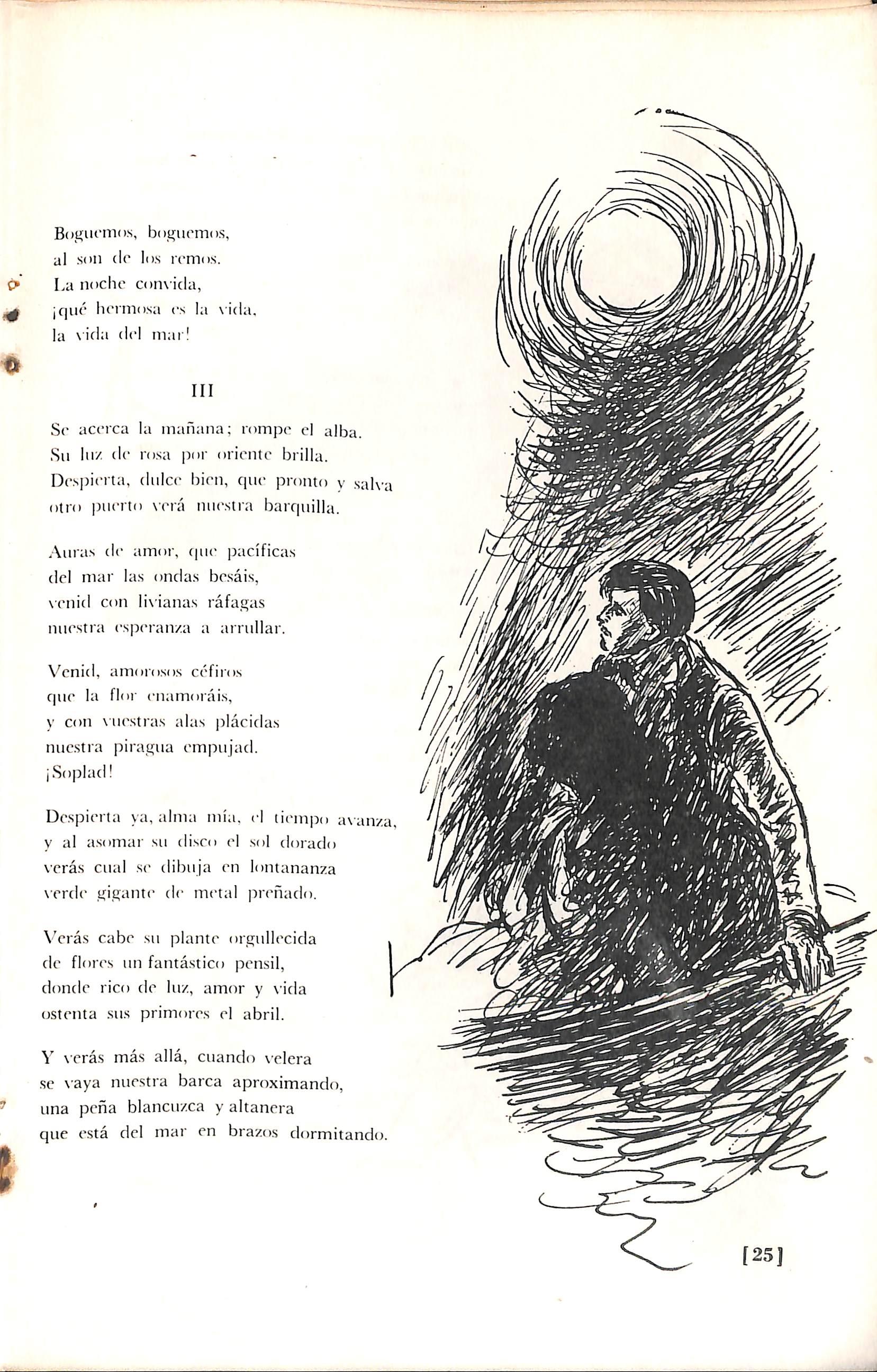 Me mata el ansia: un siglo es cada hora. ¡Cuánto tarda ese sol! Mi bien, boguemos, que ya la luz se extingue de la aurora.