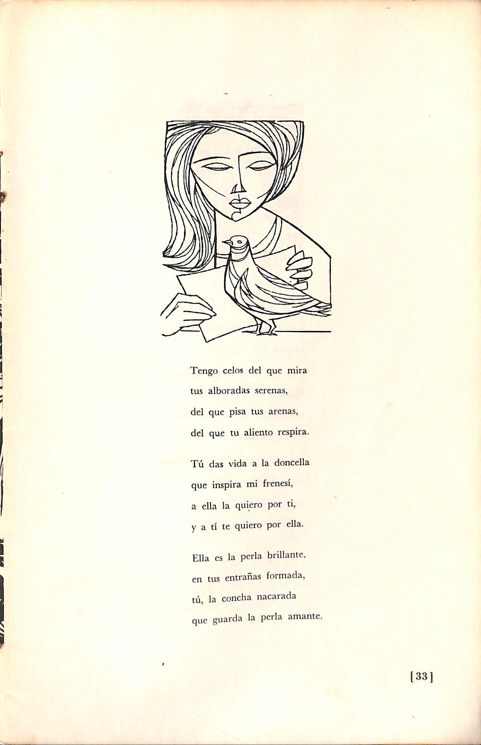 Ella es la perla brillante, en tus entrañas formada, tú, la concha nacarada que guarda la perla amante.