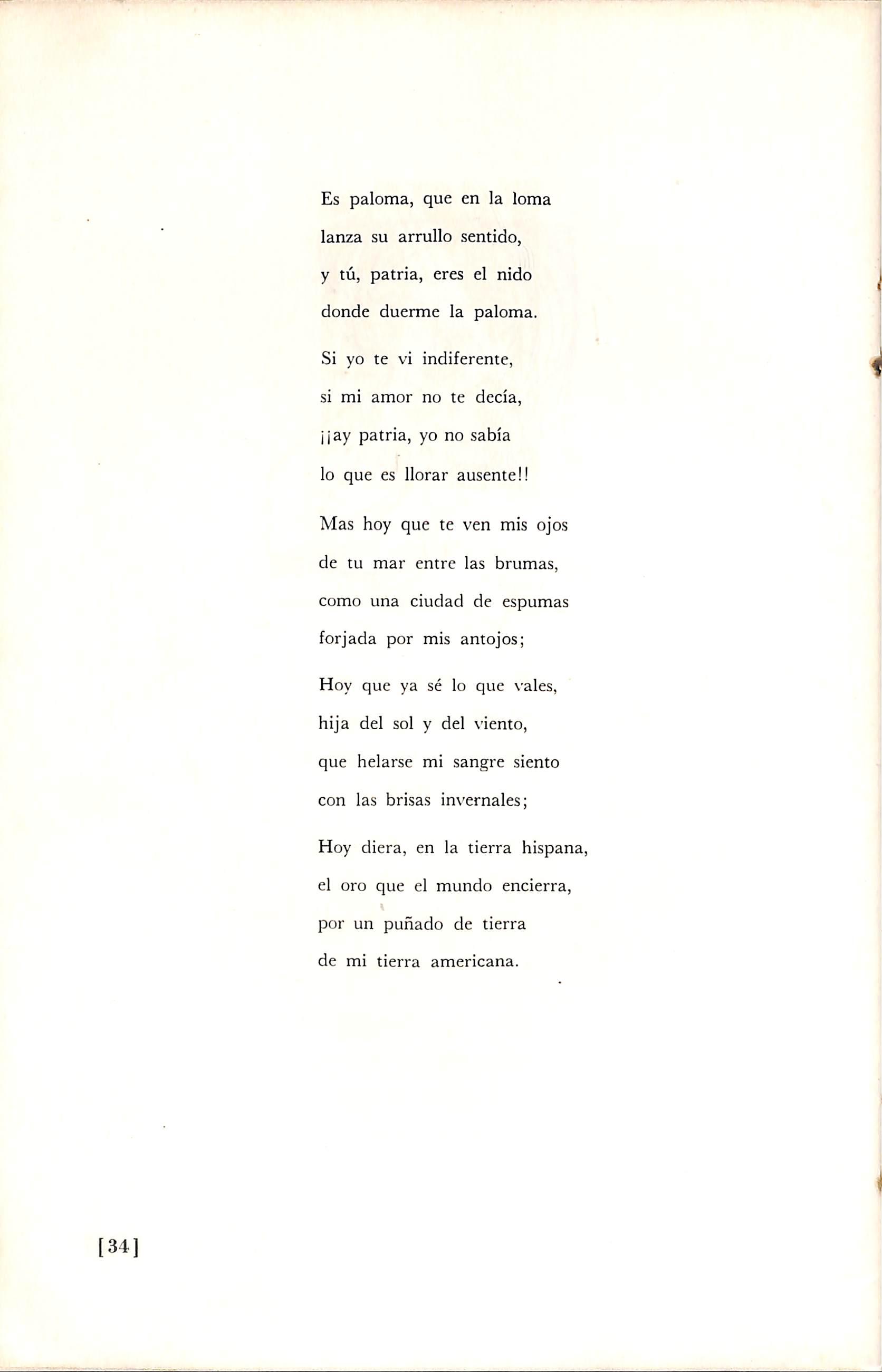 Es paloma, que en la loma lanza su arrullo sentido, y tú, patria, eres el nido donde duerme la paloma.