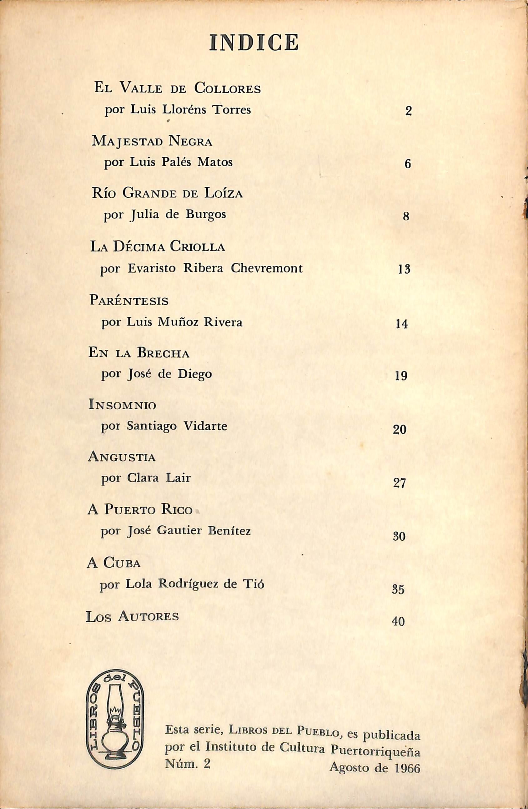 INDICE El Valle de Collores por Luis Lloréns Torres Majestad Negra por Luis Palés Matos RÍO Grande de Loíza por Julia de Burgos La décima Criolla por Evaristo Ribera Chevremont Paréntesis por Luis Muñoz Rivera En la Brecha por José de Diego Insomnio por Santiago Vidarte Angustia por Clara Lair A Puerto Rico por José Gautier Benítez A Cuba por Lola Rodríguez de Tió Los Autores 13 14 19 20 27 30 35 40