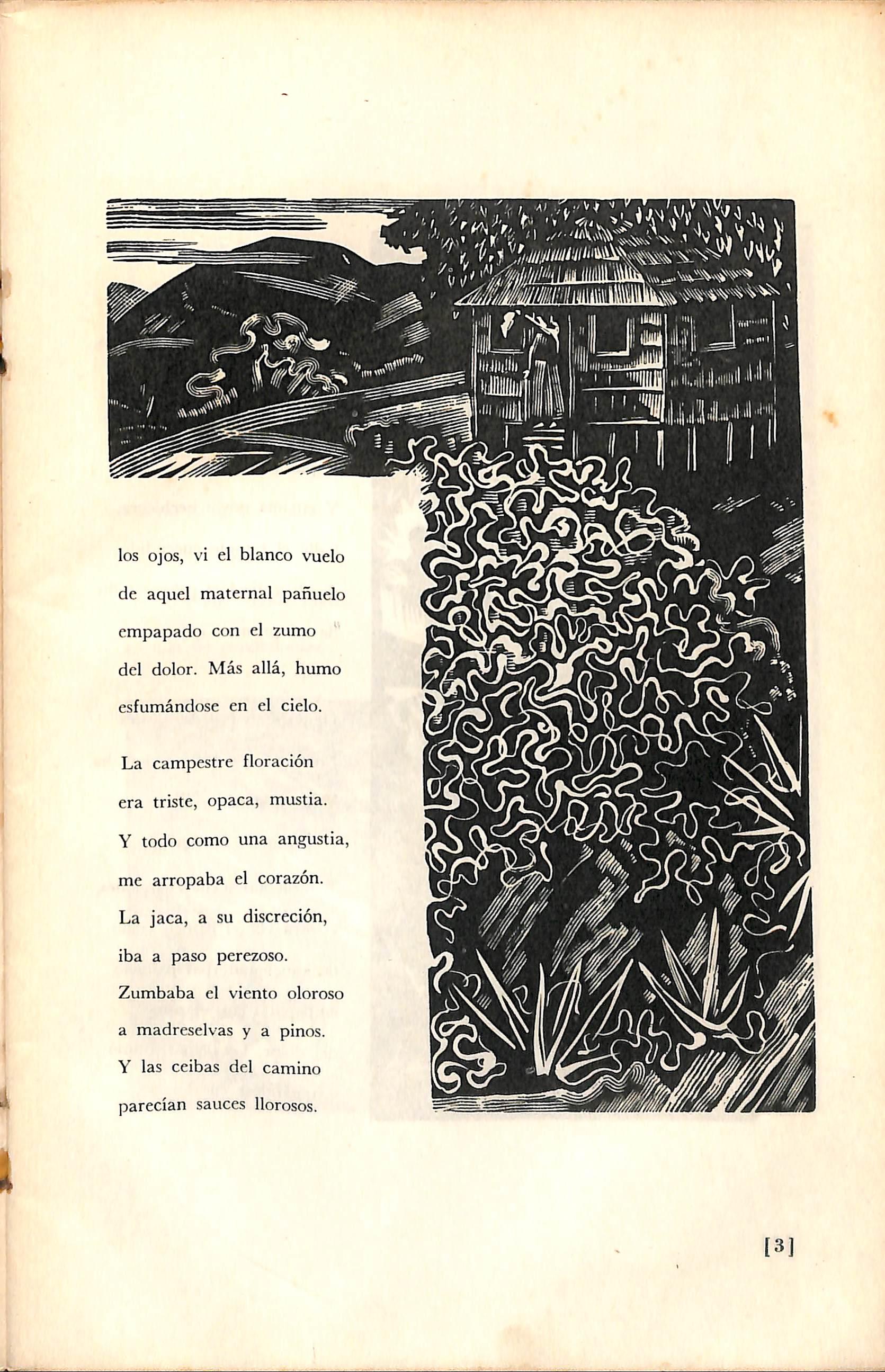 ...Y el andrajo de pajas del pobre caserío, y el andrajo de gentes y el escuálido río, y los pueblos cuadrados con la iglesia en el centro y el cementerio junto; estanques muertos dentro del perenne bullir y saltar de las olas, perenne ante mi álmá impaciente y a solas. Por doquiera que voy, por doquiera que vaya, en el vaho soporoso de mestizo y quincalla. • • La misma semimuerta vida del pueblo atado por el mar implacable, de costado a costado - ■ ■