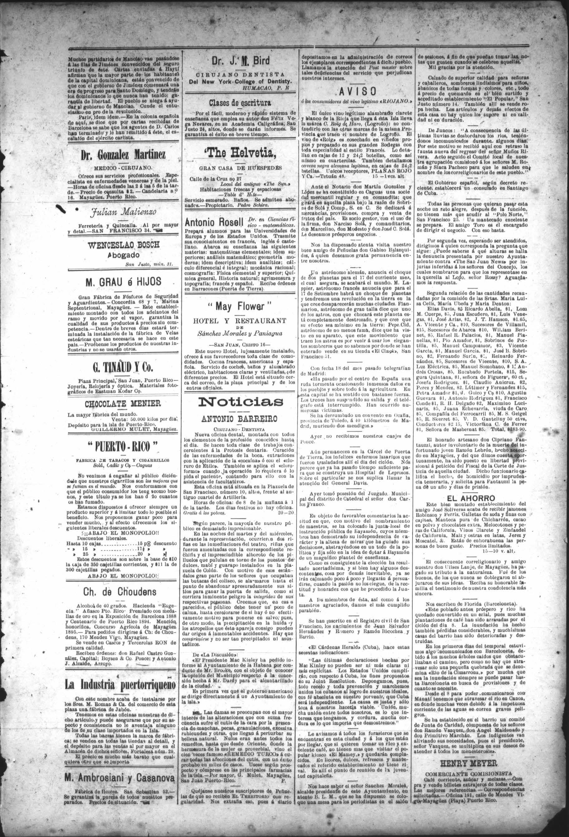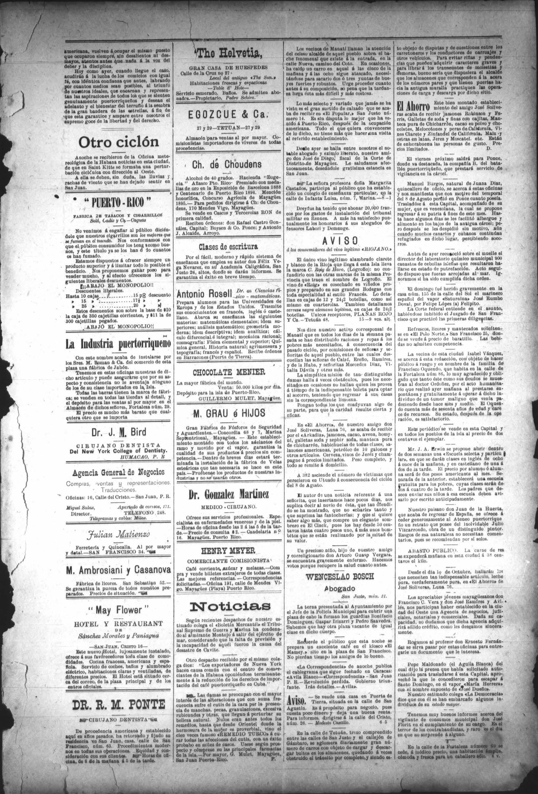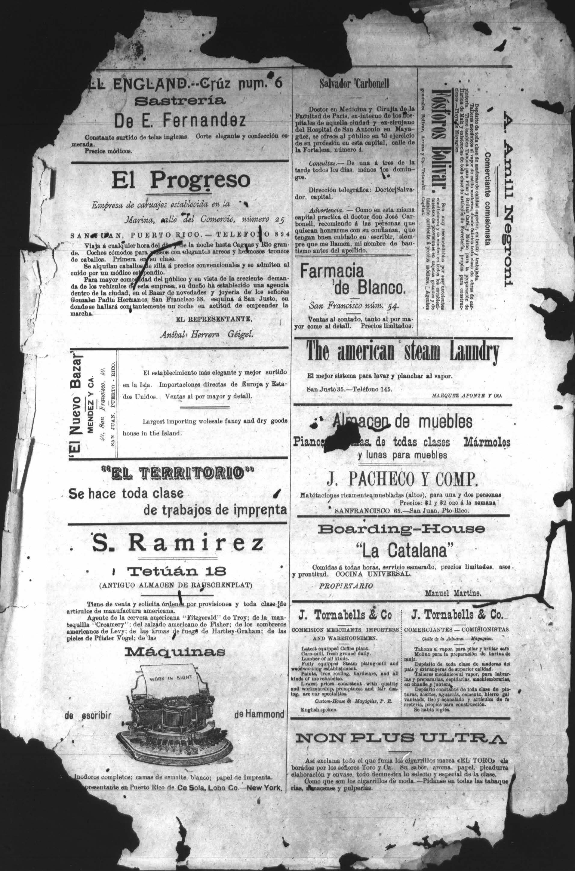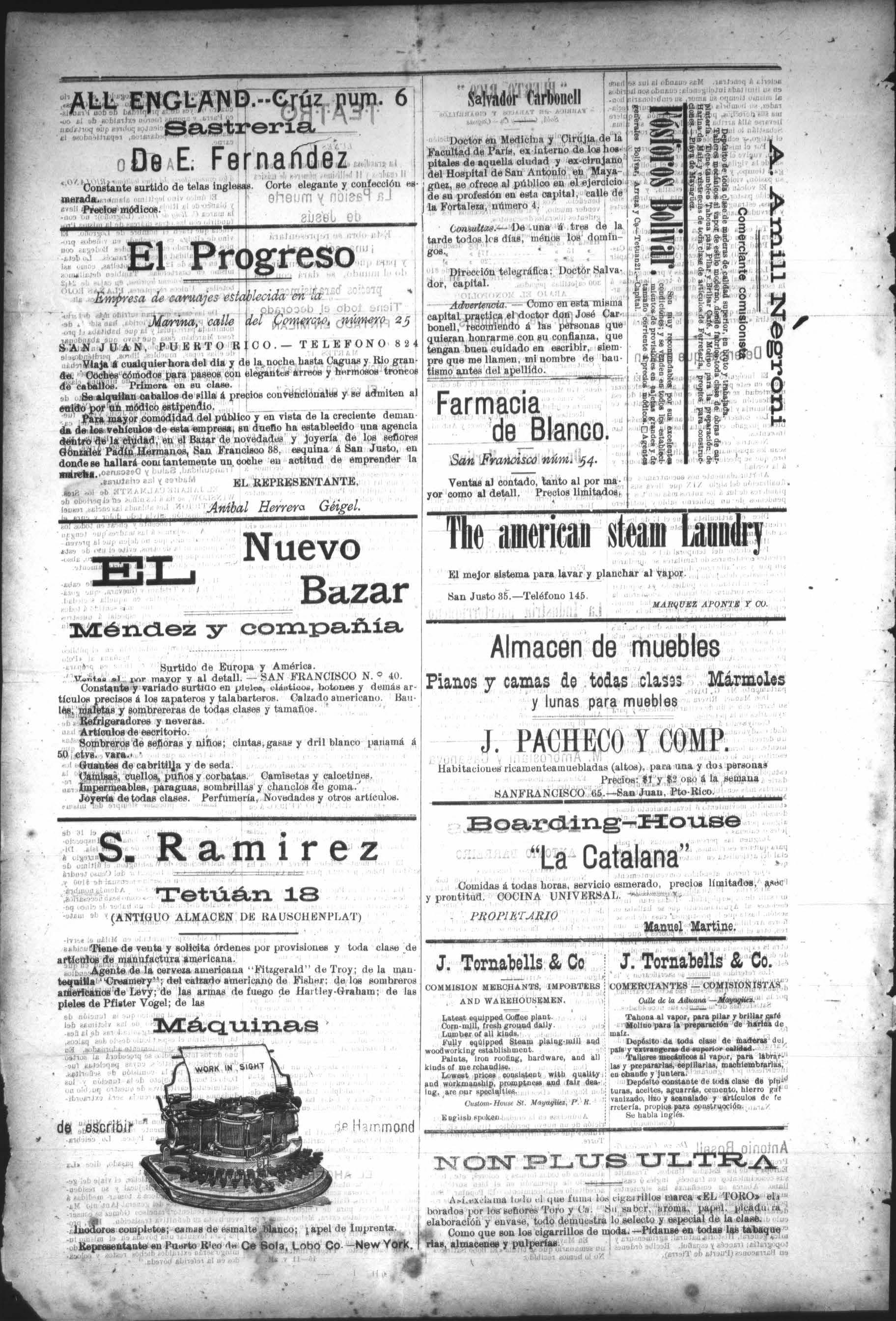 Manuel Martine. J. Tornabells 8 Co | J. Tornabells 8 Co. COMMISION MERCHANTS, IMPORTERS COMERCIANTES COMISIONISTAS AND WAREHOUSEMEN, Culle de la Aduana Mayagisez. Latest equipped Coffee plant. - Corn-mill, fresh ground dally. Lumber of all kinds. ma fully equipped Steam plaing-mill and weodworking establishment. Paints, iron rooting, hardware, and all kinds of me rchandise. = Lowest prices consistent with quality and workmanship, promptness and fair dea- Depósito constante de toda clase de pining, are our specialties. turas, aceites, aguarrás, cemento, hierro gal Qustom-House St Mayagiies, P. R. vanizado, lizo y acarialado y artículos de fe rretería, propios rnn construcción. Se habla inglés. Tahona al vapor, para pilar y brillar eaté Molino para la preparación de harina de íz. Depósito de- toda clase de maderas del país y extrangeras de superior leres mecánicos al vapor, labrarembrarias, las y pre las, cepillarlas en om¿.;l;unm¡? NON PLUS ULTRA Así 9iclamn todo el que fuma los cigerrillos marca <EL porados los señores Toroy Ca. Su vabor, aroma. pao iboraciónyenvaso, todo demuestralo