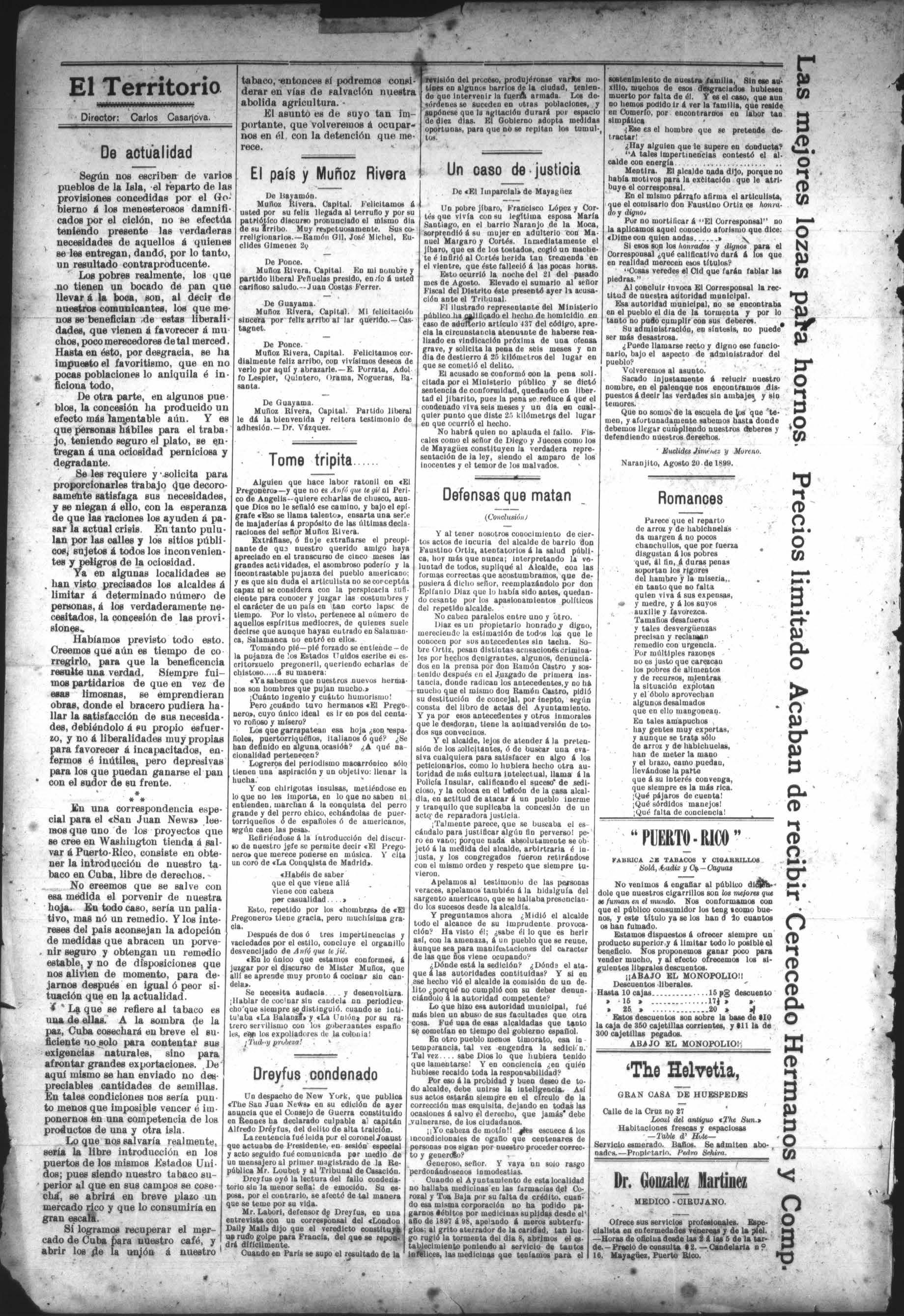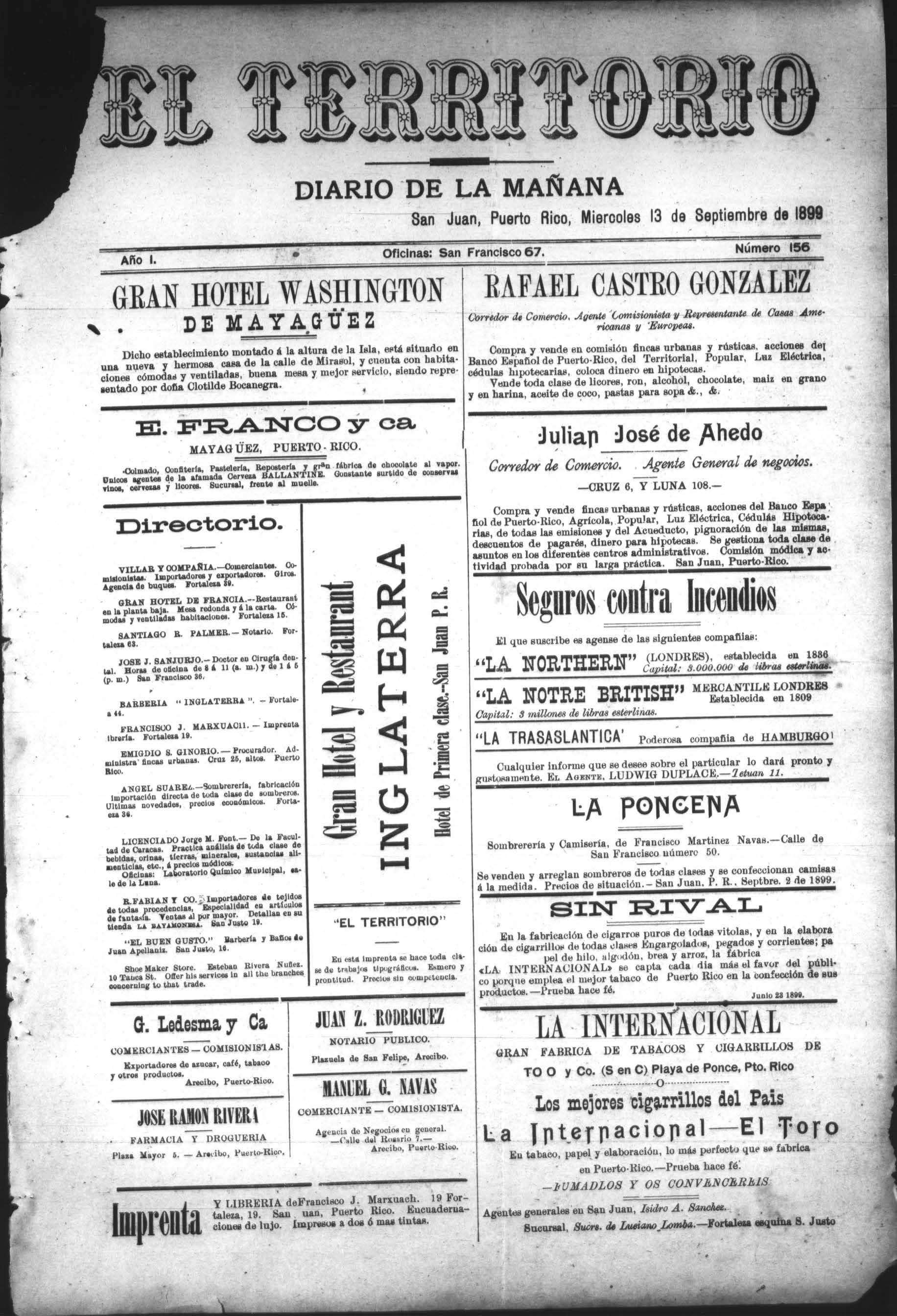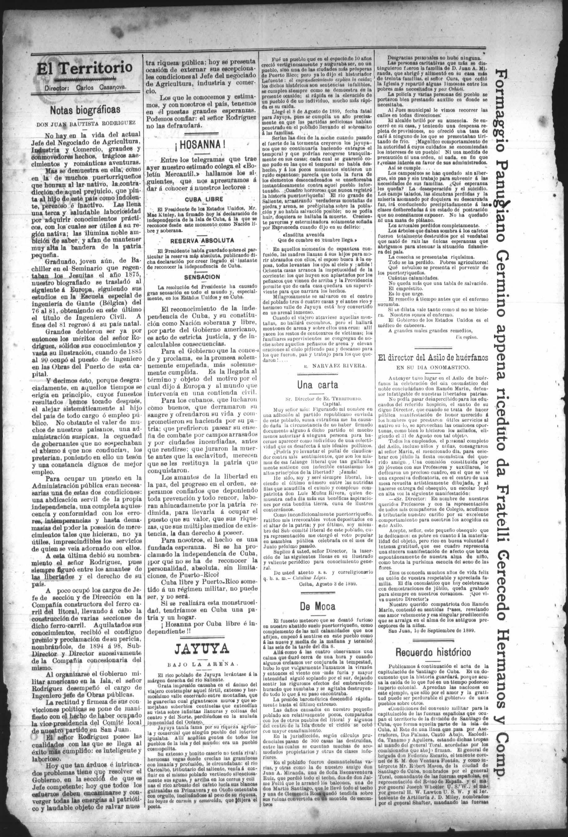 San Juan Puerto-Rico, 26 de Septiembre 1899. Sr. Director de EL TERRITOTIO.