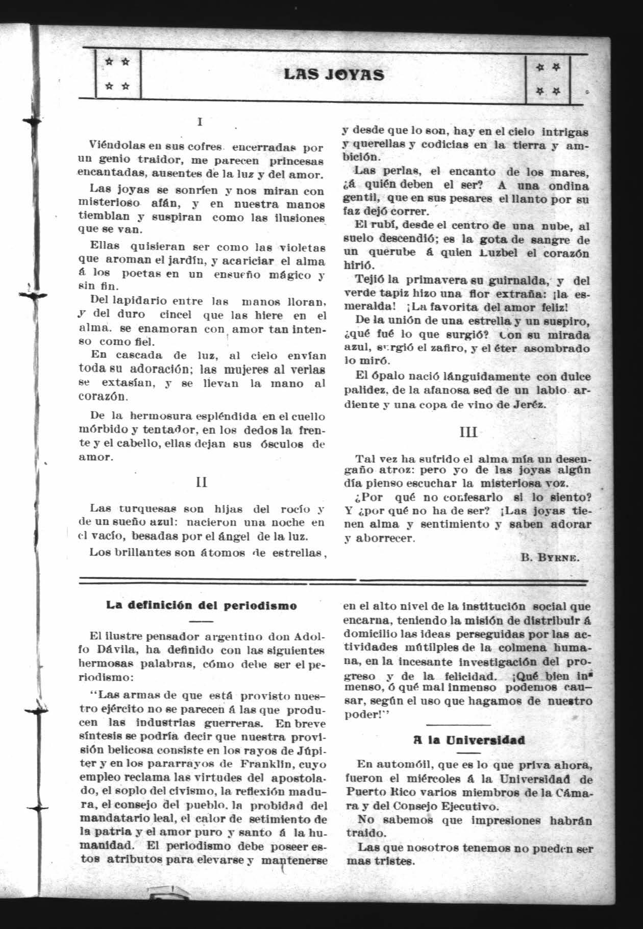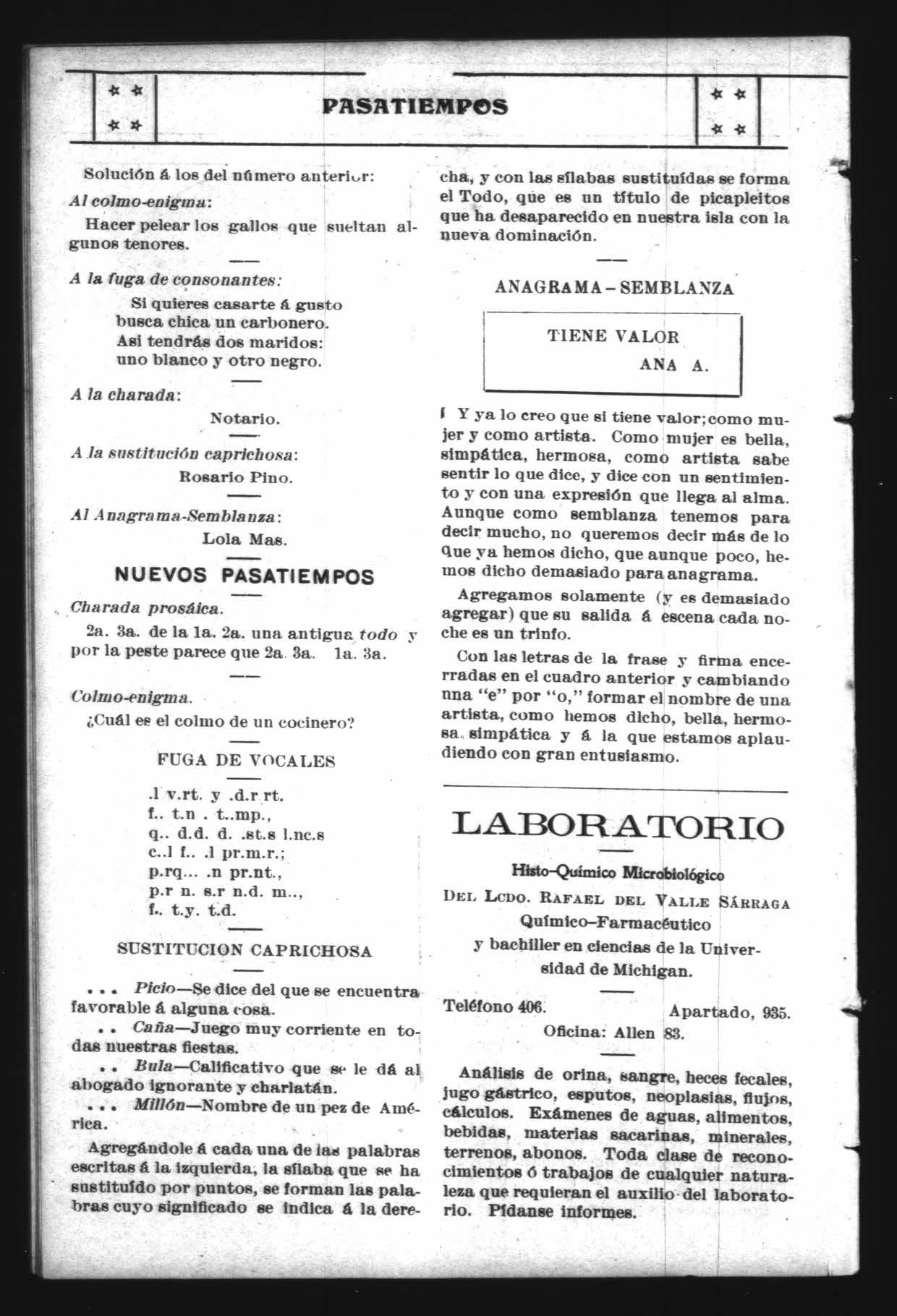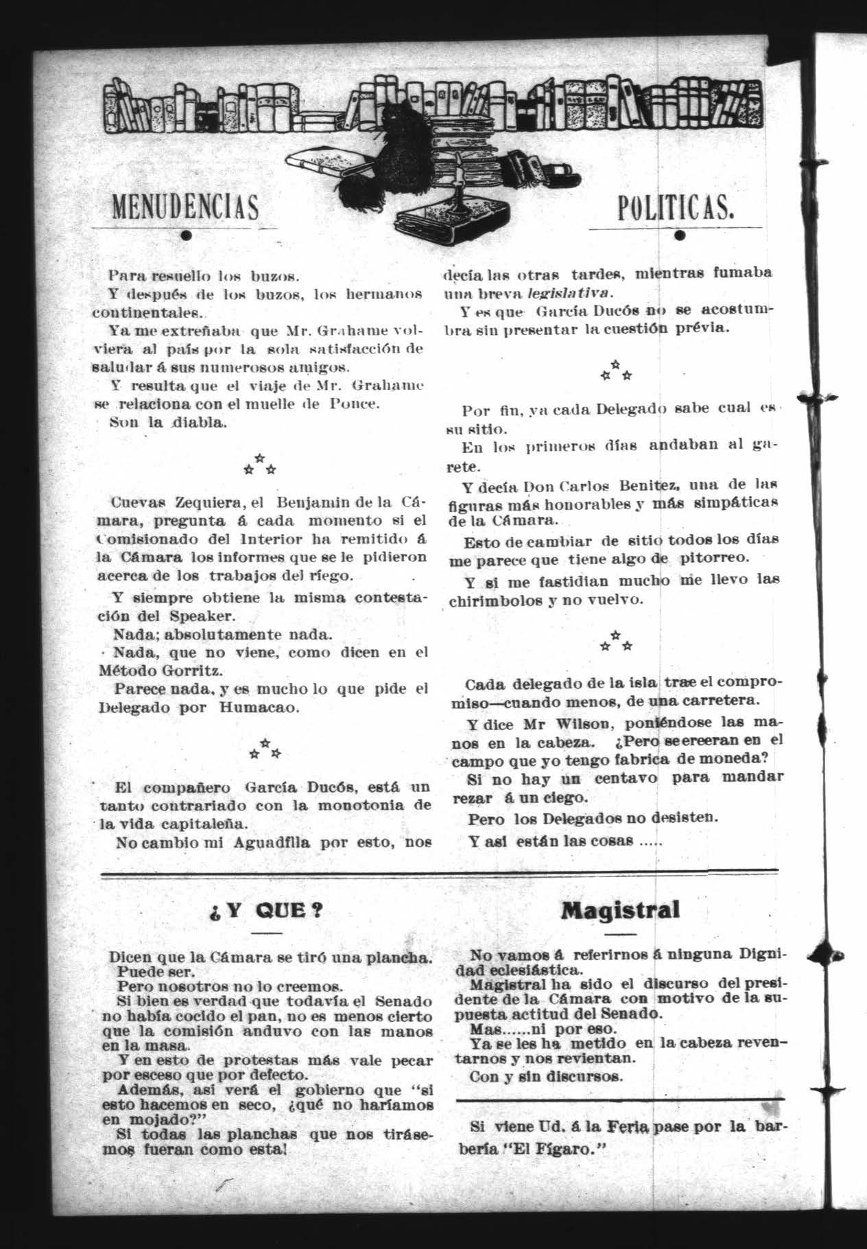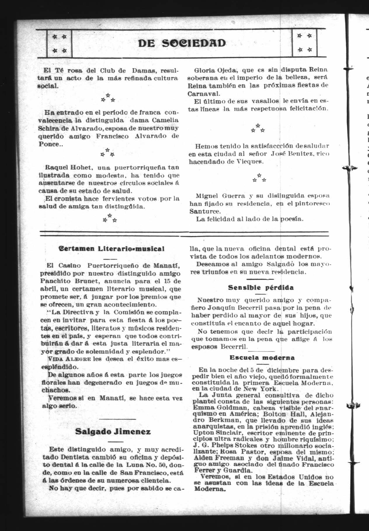 Al quedar instalados los nuetalleres de fotograbado, el director artistico llevará á la caricatura con la consideración y el respeto que merecen, las poetisas, escritoras, y artistas puertorriqueñas, á imitación de las Ke-