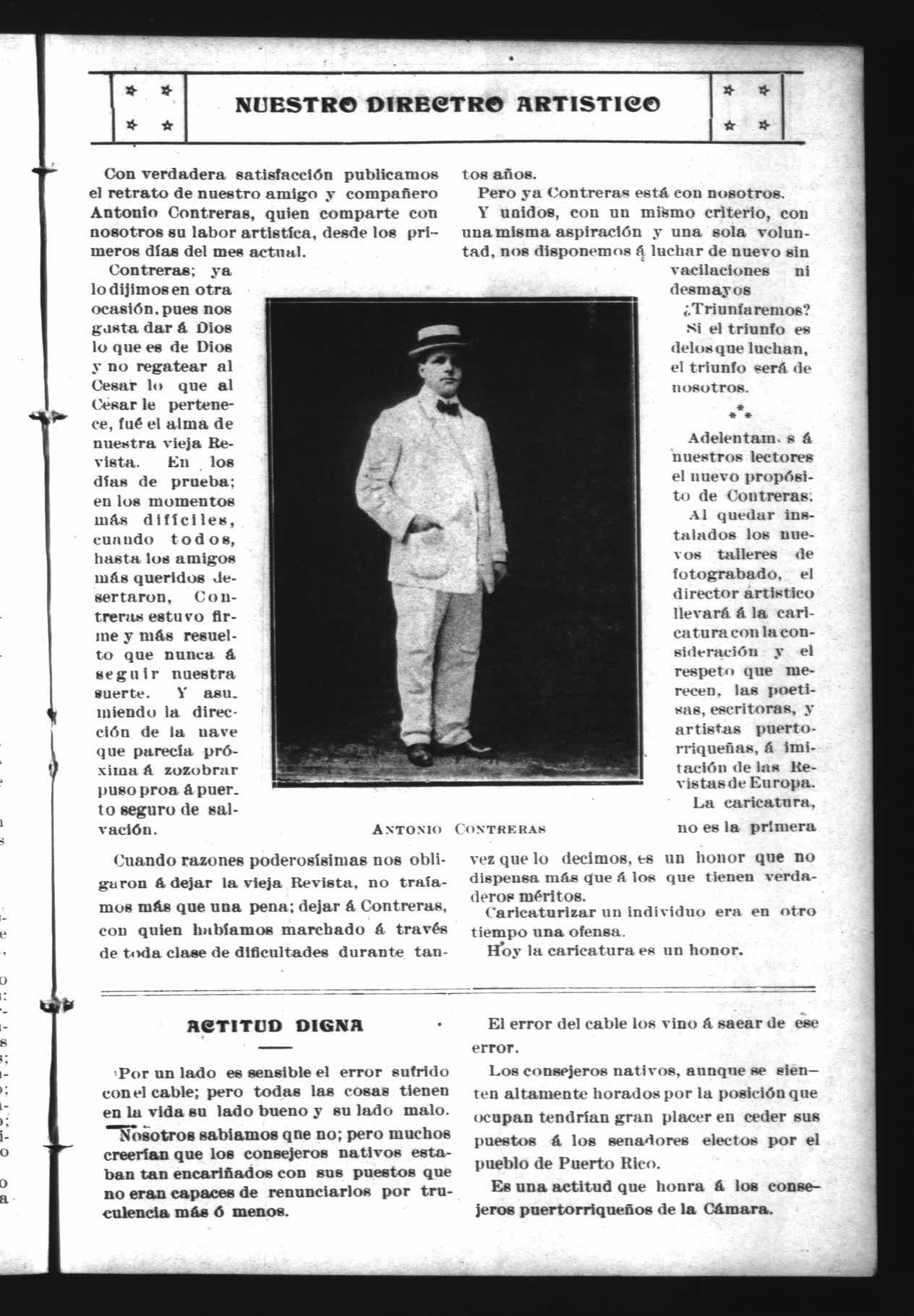 Con verdadera satisfacción publicamos el retrato de nuestro amigo y compañero Antonio Contreras, quien comparte con nosotros su labor artistíca, desde los primeros días del mes actual. Contreras; ya lo dijimosen otra ocasión, pues nos gusta dar á Dios lo que es de Dios y no regatear al Cesar lo que al Cesar le pertenece, fué el alma de nuestra vieja Revista. En los días de prueba; en los momentos más difíciles, cunndo todos, hasta los amigos más queridos Jesertaron, Contrerus estuvo firme y más resuelto que nunca á seguir nuestra suerte. Y asu. miendo la dirección de la nave que parecía próxima á zozobrar puso proa á puer. to seguro de salvación.