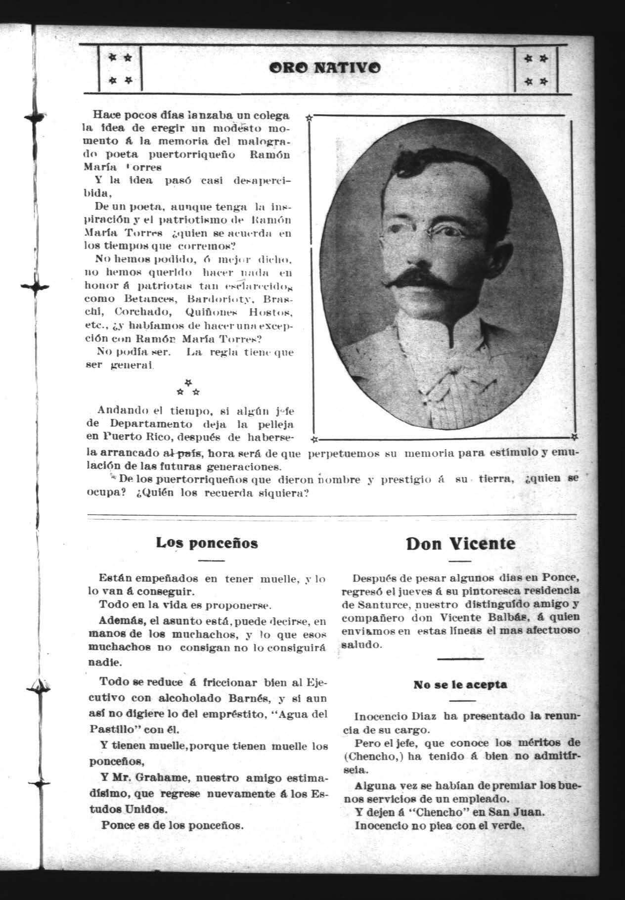 No hemos podido, 6 mejor dicho, ho hemos querido hacer nada en honor á patriotas tan eselarecidos como Betances, Bardorioty, Braschi, Corchado, Quiñones MHostos, etc., ¿y habíamos de hacer una excepción con Ramór María Torres?