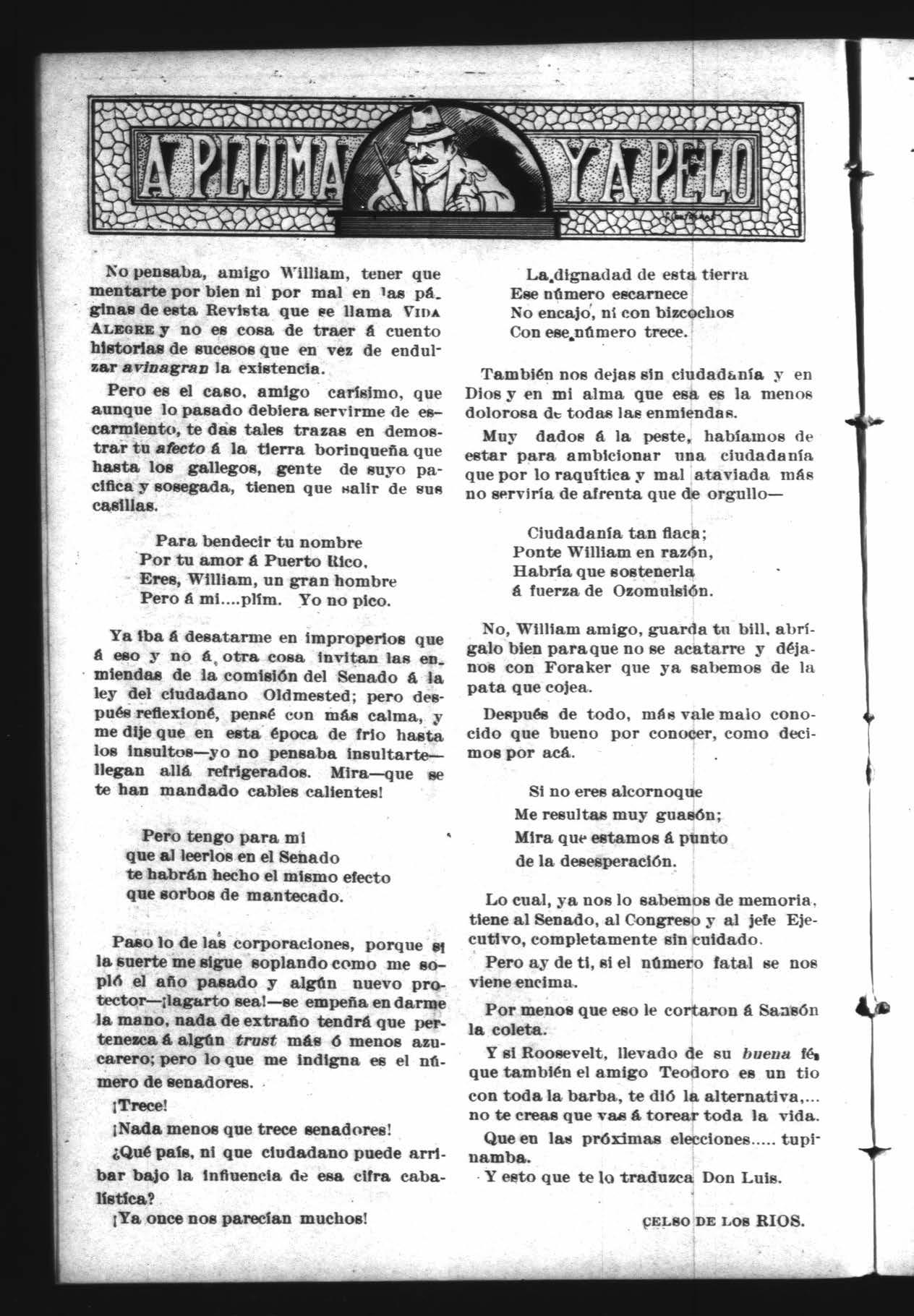Pero es el caso, amigo carísimo, que aunque lo pasado debiera servirme de escarmiento, te das tales trazas en demostrar tu afecto á la tierra borinqueña que hasta los gallegos, gente de suyo pacifica y sosegada, tienen que salir de sus casillas.