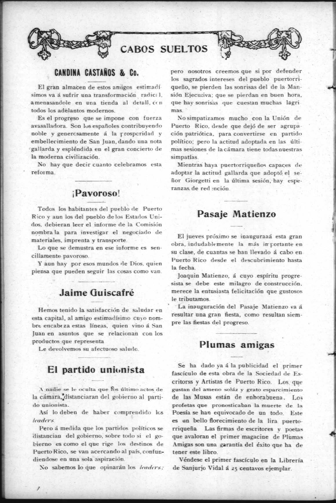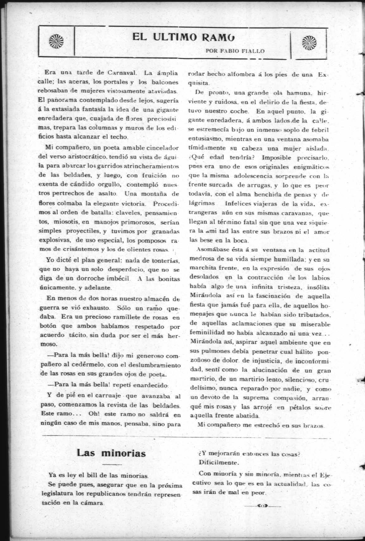 Era una tarde de Carnaval. La ámplia calle; las aceras, los portales y los balcones rebosaban de mujeres vistosamente ataviadas. El pañorama contemplado desde lejos, sugería á la extasiada fantasía la idea de una gigante enredadera que, cuajada de flores preciosísi mas, trepara las columnas y muros de los edi ficios hasta alcanzar el techo.