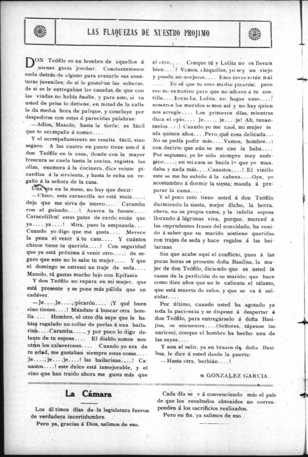 el otro.... Conque tú y Lolita no os llevais bien....? Vamos, Chiguillos, yo soy un viejo y puedo acunsejaros. ... Esas cosas estár mal YO sé que tu eres medio picarón; pero so no es nlUtiV() para que no 3d( 't$ átu costilla....Escuckta, Lolita, no hagas caso...nosotrus los maridos semos así y no hay quien nos arregle.... Los primeros días, mientras dura el opio.... Je...., je....je! Ah, tunantuelos..:.! Cuando yo me casé, mi mujer te nía quince años....Pero, qué cosa delicada... No se podía pedir más....Vamos, hombre..! con decirte que aún se me cae la baba.... Por supuesto, yo hr sido siempre muy enérgico....; en micasa se hacía in que yo man. daba y nada más....Canastos....! El vinillo este se me ha subido á la cabeza....Oye, yo acostumbro á dormir la siesta; manda á pre: parar la cama....