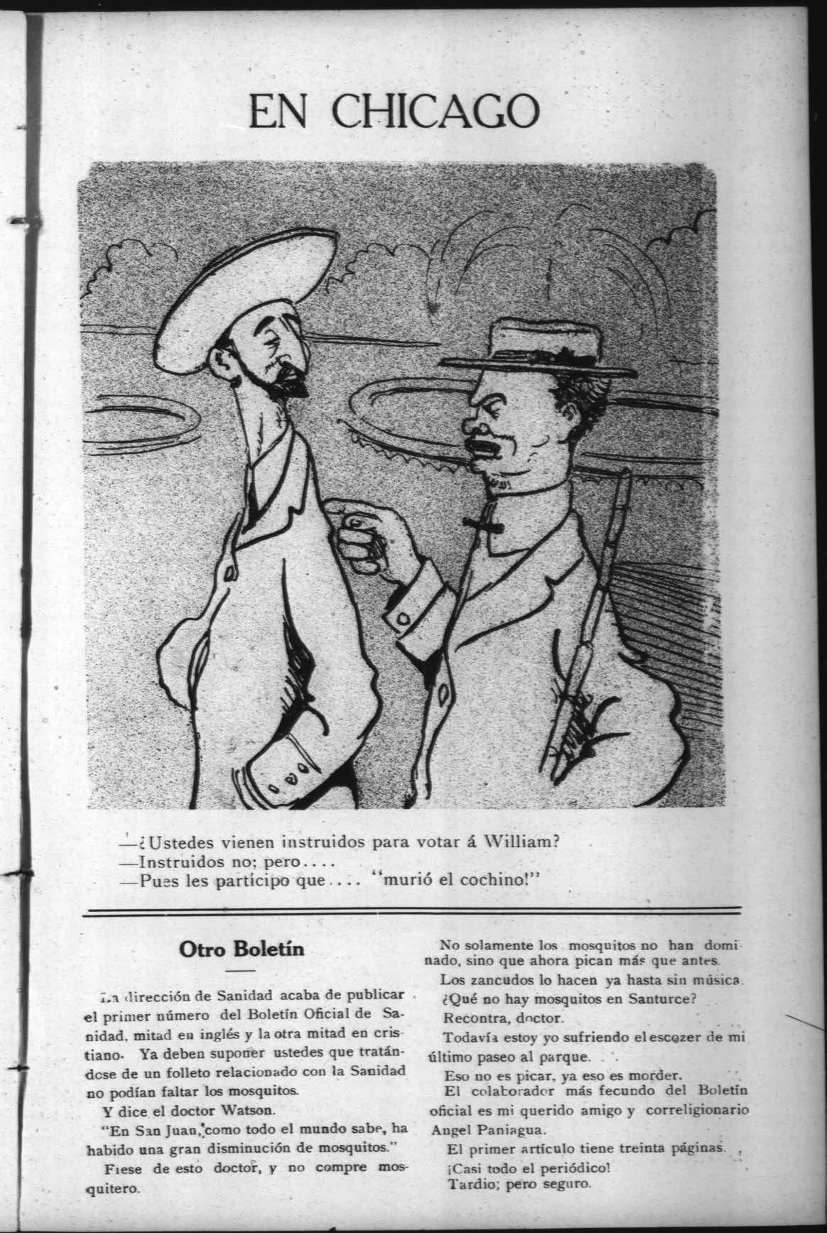 1.1 dirección de Sanidad acaba de publicar el primer número del Boletín Oficial de Sa. nidad, mitad en inglés y la otra mitad en cristiano. Ya deben suporíer ustedes que tratándcse de un folleto relacionado con la Sanidad no podían faltar los mosquitos.