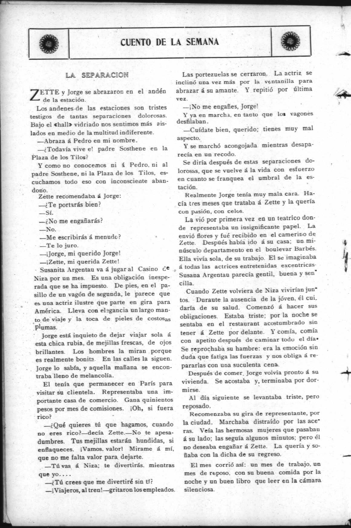 Nada tu rosa triste á la mia le responde. Ni una palabra suya la cámara recoge. Pero reclina lenta, sus pétalos marchitus sobre los de la mia, y deposita tenue en ellos, tembiorosos, dulzores de mieles, frescuras de artíoyuelos, murmullos argentinos de encatto incomparable.