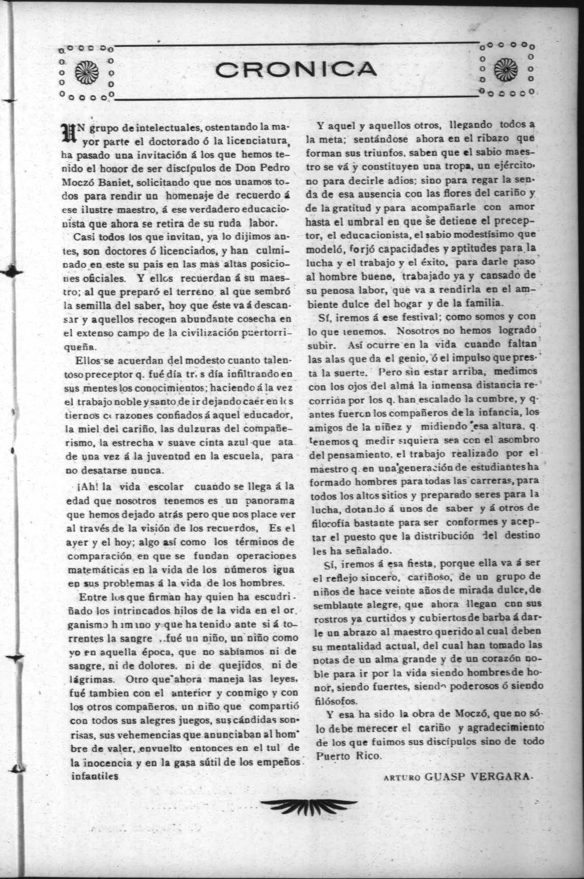 nN grupo de intelectuales, ostentando la mayor parte el doctorado ó la licenciatura, ha pasado una invitación á los que hemos tenido el honor de ser discípulos de Don Pedro Moczó Baniet, solicitando que nos unamos todos para rendir un homenaje de recuerdo á ese ilustre maestro, á ese verdadero educacionista que ahora se retira de su ruda labor.