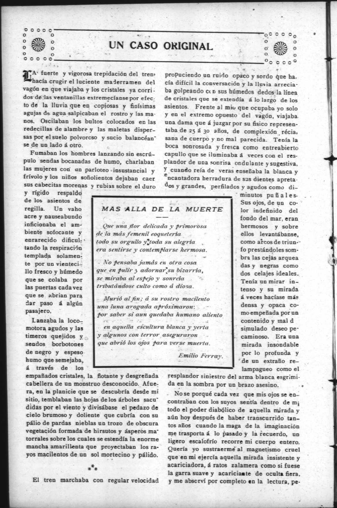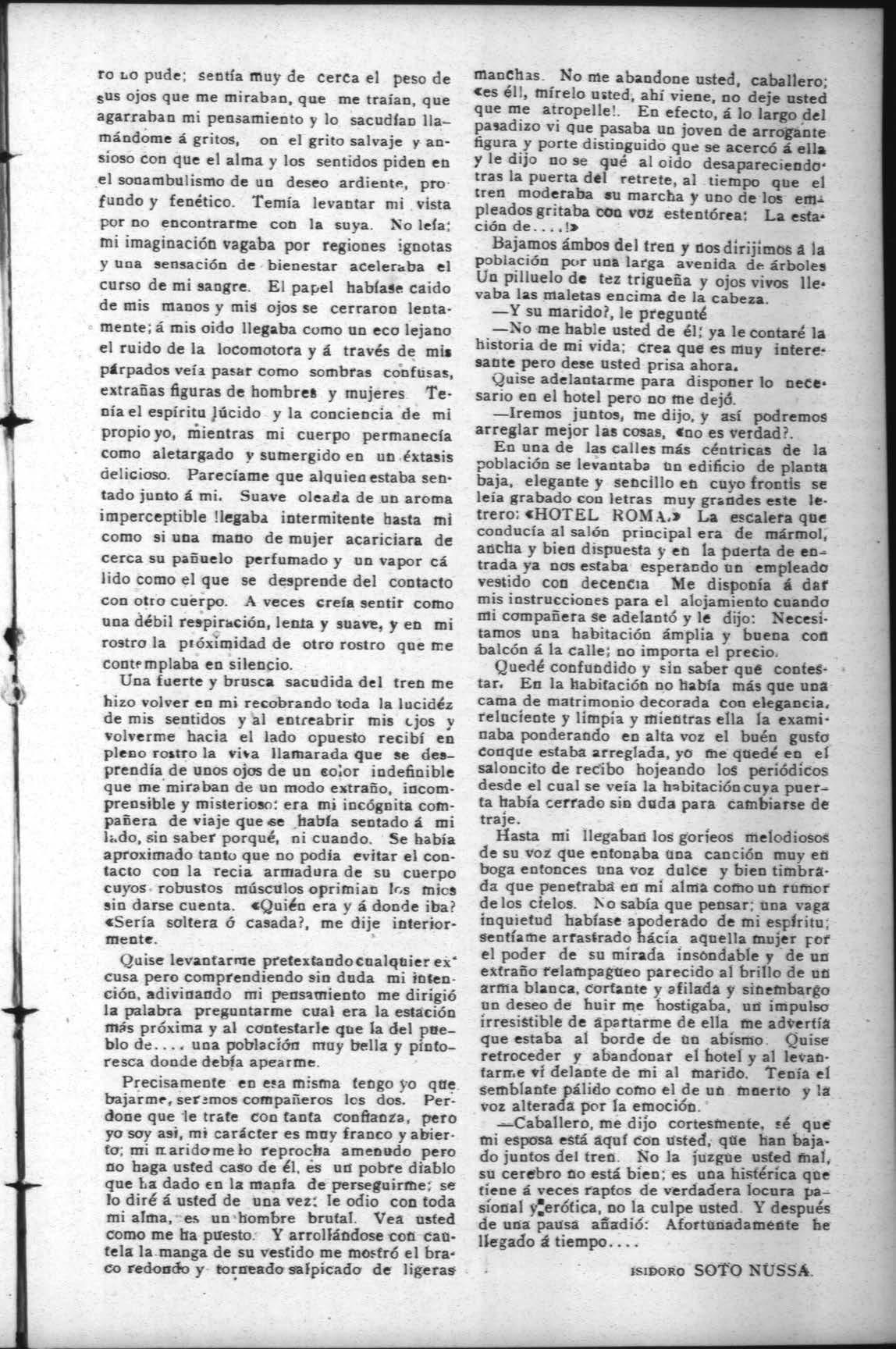 Una fuerte y brusca sacudida del tren me hizo volver en mi recobrando toda la lucidéz de mis sentidos yal entreabrir mis cjos y volverme hacia el lado opuesto recibí en pleno rostro la viva llamarada que se desprendía de unos ojos de un eoior indefinible que me miraban de un modo extraño, incomprensible y misterioso: era mi incógnita compañera de viaje quese había sentado á mi lado, sin saber porqué, ni cuando. Se había aproximado tanto que no podia evitar el contacto conm la recia armadura de su cuerpo cuyos- robustos músculos oprimian les mics sin darse cuenta. «Quién era y á donde iba? «Sería soltera ó casada?, me dije interiormente.