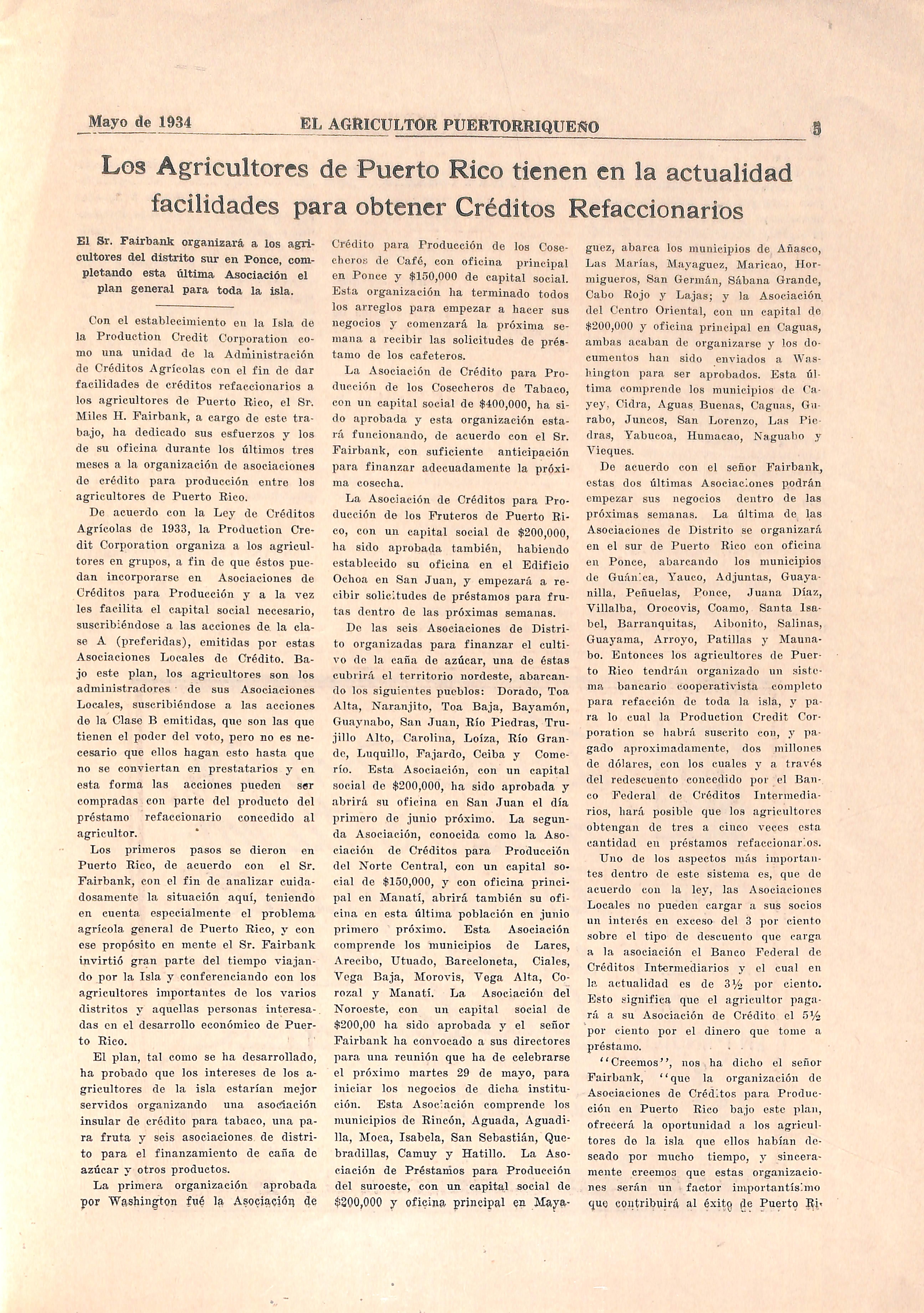 Con el establecimiento en la Isla de la Produetion Gredit Corporation co mo una unidad de la Administración de Créditos Agrícolas con el fin de dar facilidades de créditos refaccionarios a los agricultores de Puerto Eico, el Sr. Miles H. Fairbank, a cargo de este trabajo, ha dedicado sus esfuerzos y los de su oficina durante los últimos tres meses a la organización de asociaciones do crédito para producción entre los agricultores de Puerto Eico.