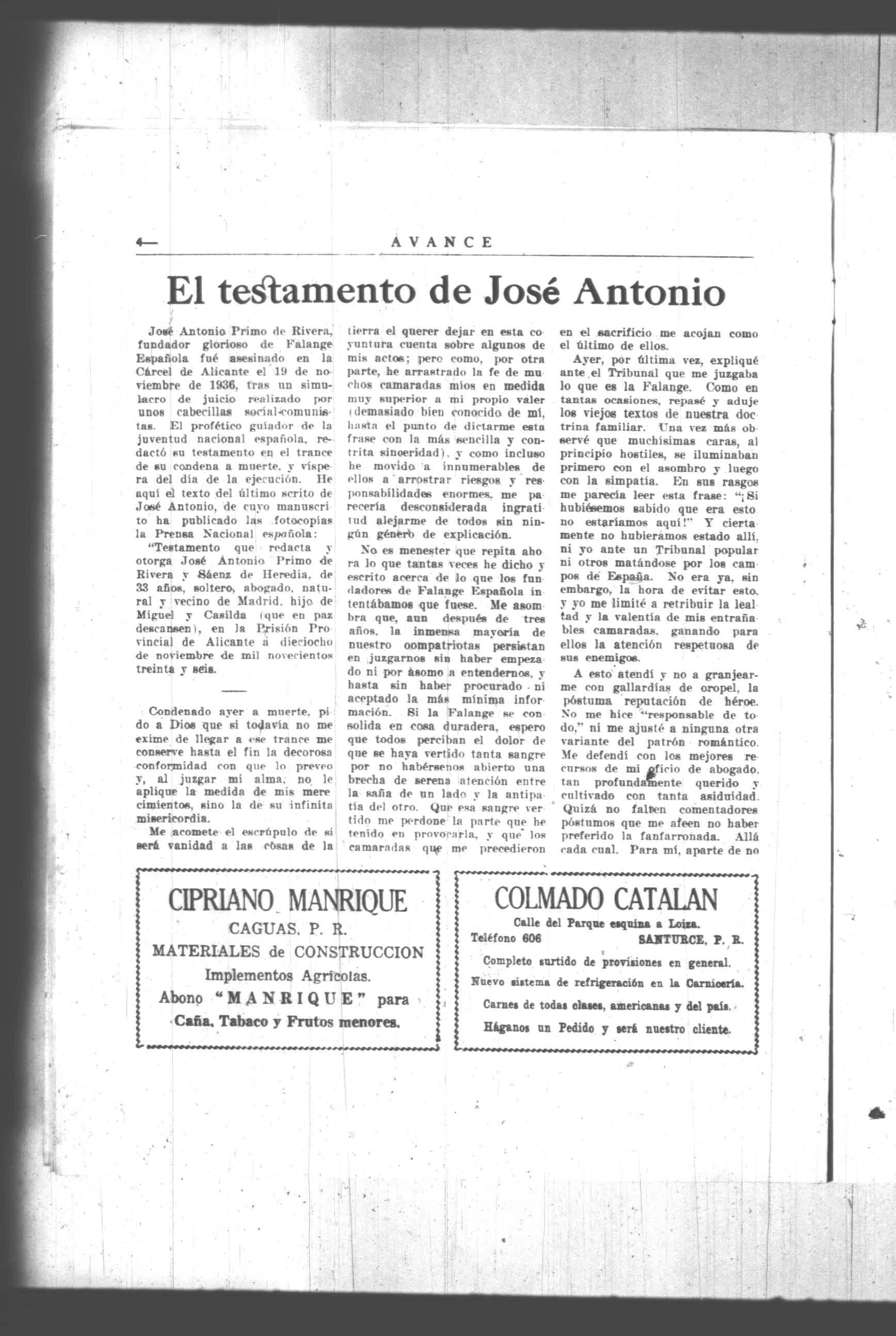 José Antonio Primo de Rivera, fundador giorioso de Falange ¿spañola fué asesinado en la Cárcel de Alicante el 19 de noviembre de 1936, tras un simulacro de juicio realizado por unos cabecillas social-comunistas. El profético guíador de la juventud nacional española, re-dactó su testamento en el trance de su condena a muerte, y víspe ra del día de la ejecución. He aquí el texto del último scrito de José Antonio, de cuyo manuecri to ha publicado las q.fotocopías la Prensa Nacional española: