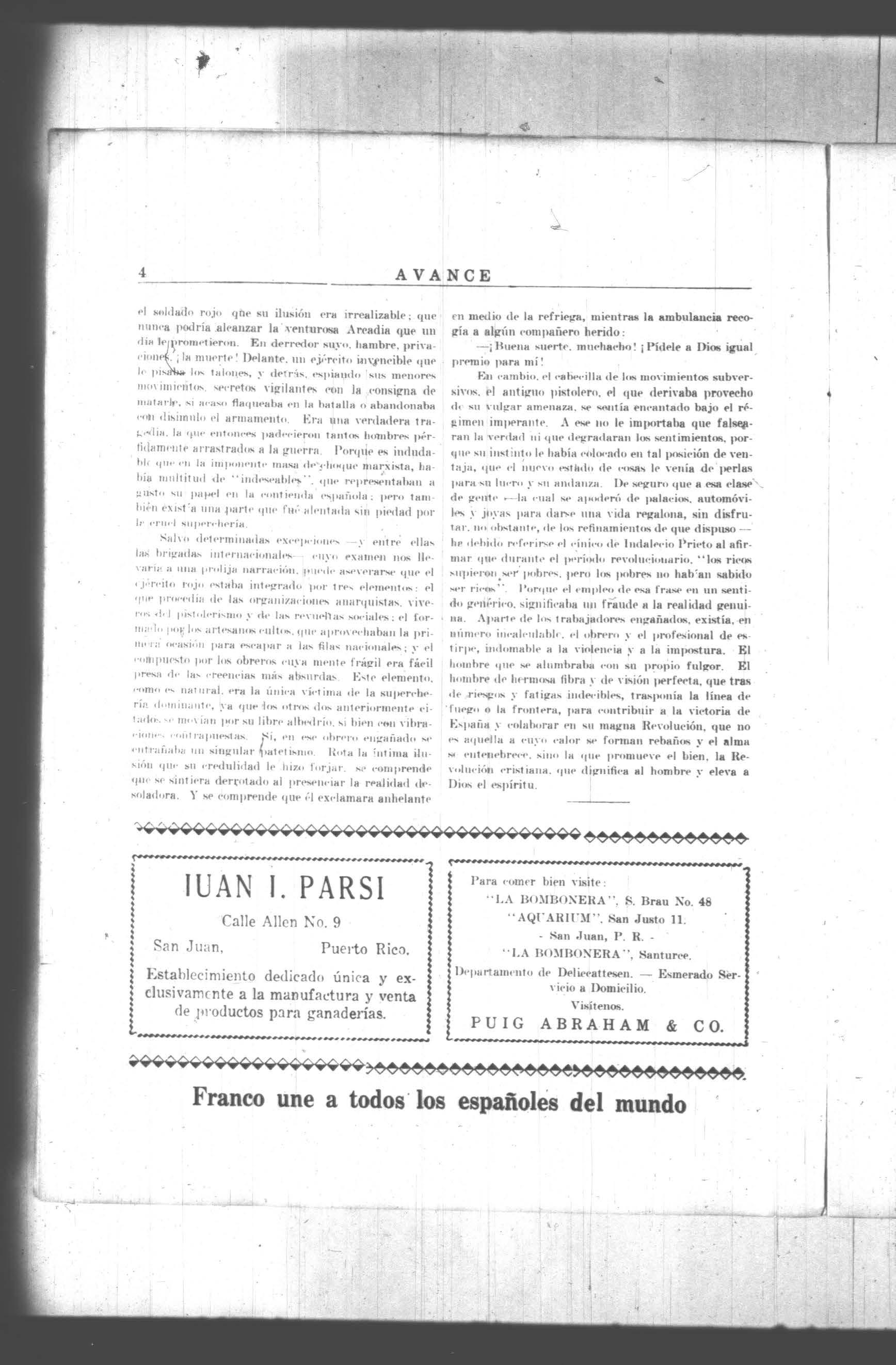 addc -e e r ee T e d a S S S i. AVAN CE Z =>->-- ====£ === ---->=<I=<=<==2>,-»T-------r------= =- BRAN (88- Proof) DISTRIBUIDORES: DAVITLA HNOS., INC:SAN JUAN, P. R: Y JEREZANO - V. O.Manuel Fernández £ Co., S. L. - Jerez ==) .de la Frontera (LA CASA DEL LICOR) - &&Xm,x : =_ == Z = < nm=EZEE zzzaz == =£=[==== = J* __,? _ U eOE1 | Camilo Dominguez Co. % f,; SALVADOR BRAU 45,Insuperable £ 47 0R 5(5 SAN JUAN, T. Rde SCHLITZ $)¡ E? Gran bazar de noveda-- 35 des; ropa hecha paraseñoras: f A artículos para caballe-" ! ros; surtido grandiosog; de telas; objetos para. g) regalos. 3 ?é% La tienda preferida por;;* sus precios limitados.! S ==_= >izZQzZz--->->> 5Q7 E j; AEA botellas de $color cas:ño - a % EL GLOBOJ bÍCIJ. *rwin.-Co..&lu'iaukre.hl£.5.& =l 2 SAN JUSTO 39 SAN JUAN, P. ROopyr¡:h21038.Jm.8ch1ítzBr¿"xír.gf'º 318 .LA CERVEZA QUE HIZO $FAMOSA A MILWAUKEE $ MUEBLES Y OBJETOS DE ARTE'Distríbuidoros: % PARA EL HOGAR.i DVLIIIUONres: ,BALLESTER HERMANOS en naaanonone nooao - ,wowº % ENe