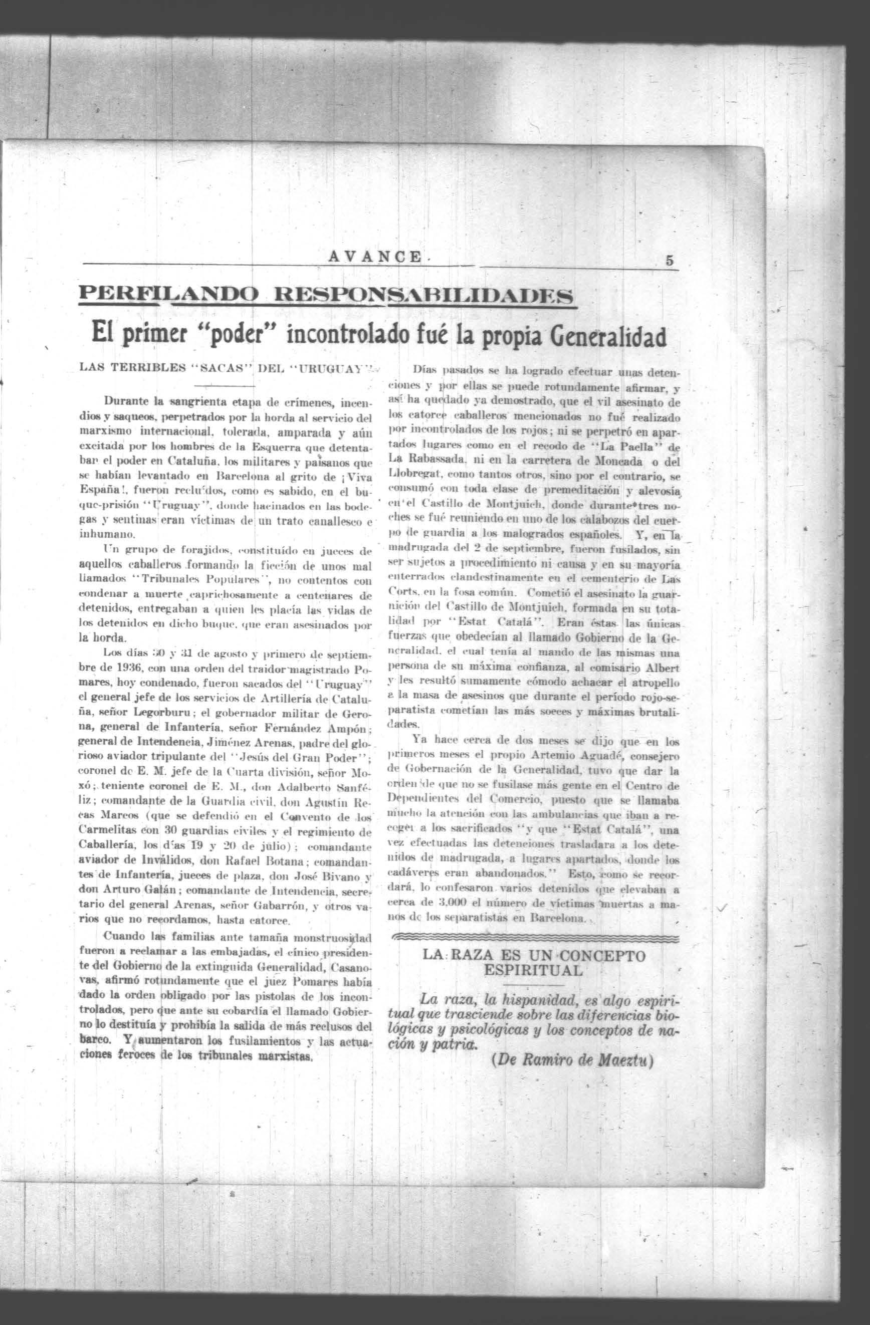 Durante la sangrienta etapa de erímenes, incendios y saqueos, perpetrados por la horda al servicio del marxismo internacional, tolerada, amparada y aún excitada por los hombres de la Esquerra que detentabar el poder en Cataluña, los militares y paisanos que se habían levantado en Barcelona al grito de ¡Viva España!, fueron reclu'dos, como es sabido, en el buque-prisión Uruguay, donde hacinados en las bodegas y sentinas eran víctimas de un trato canalleseo e inhumano.