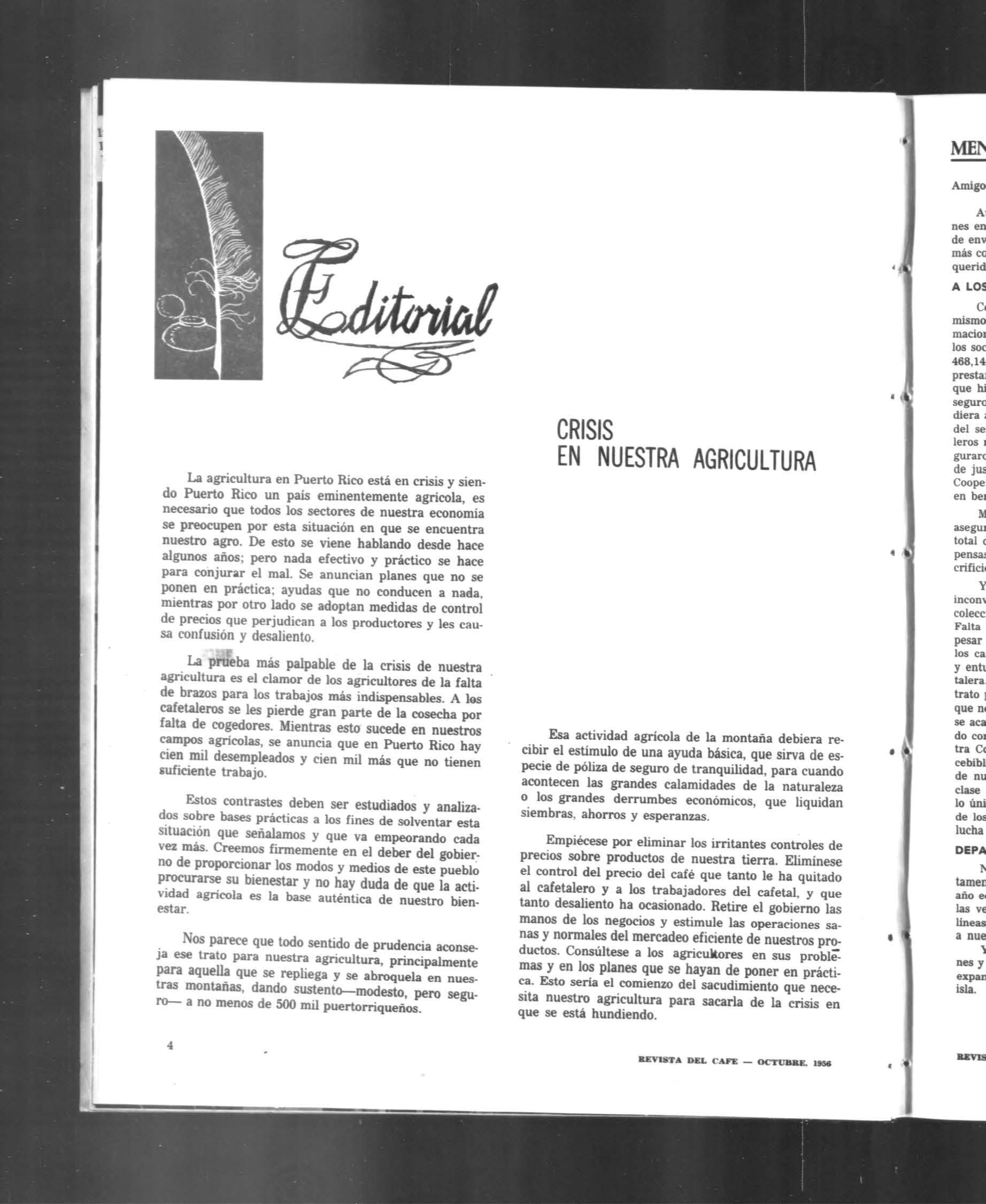 La agricultura en Puerto Rico está en crisis y sien- do Puerto Rico un país eminentemente agrícola, es necesario que todos los sectores de nuestra economía se preocupen por esta situación en que se encuentra nuestro agro. De esto se viene hablando desde hace algunos años; pero nada efectivo y práctico se hace para conjurar el mal. Se anuncian planes que no se ponen en práctica; ayudas que no conducen a nada. mientras por otro lado se adoptan medidas de control de precios que perjudican a los productores y les cau- sa confusión y desaliento.