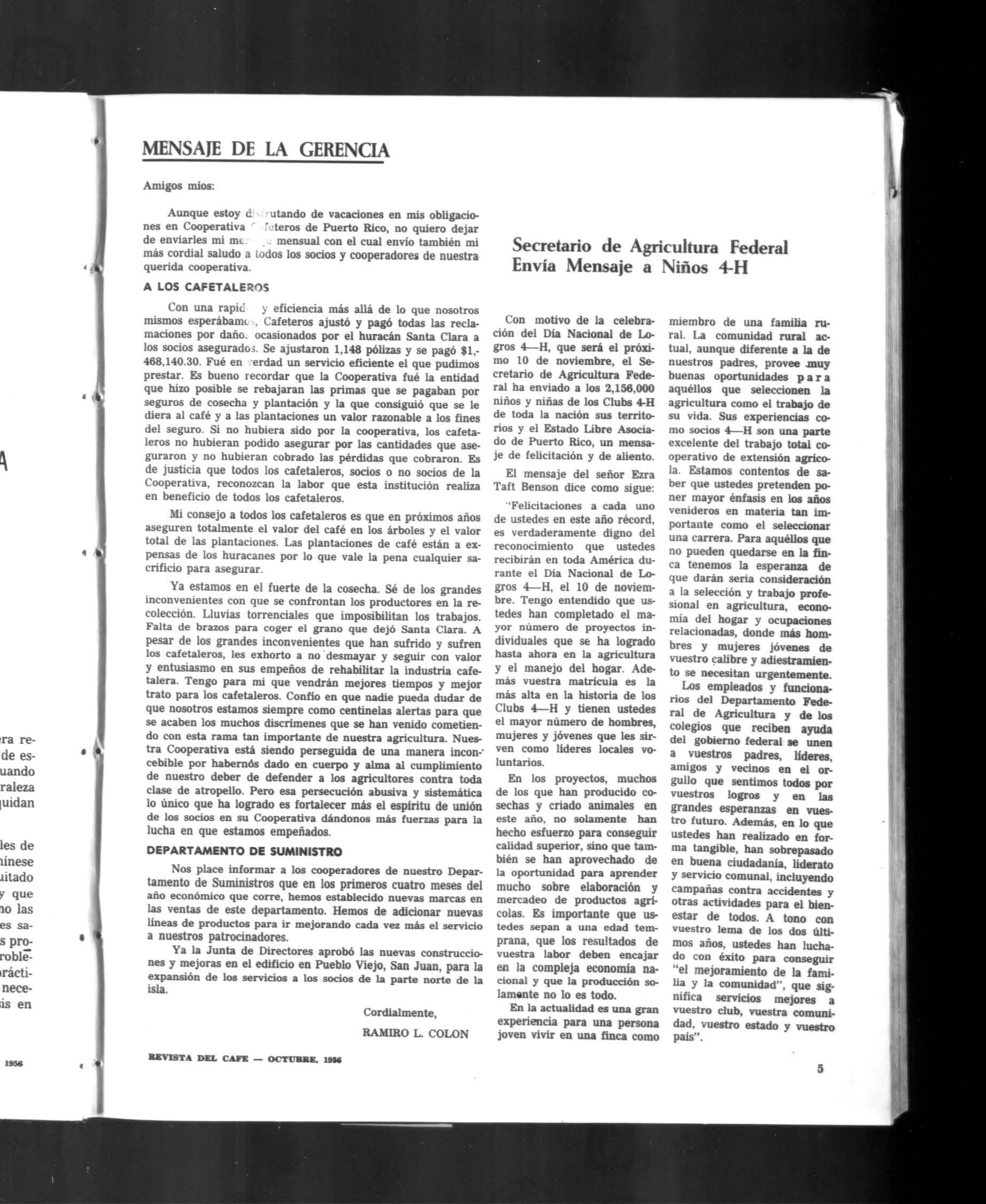 Aunque estoy d:- rutando de vacaciones en mis obligaciones en Cooperativa f<teros de Puerto Rico, no quiero dejar de enviarles mi me mensual con el cual envío también mi más cordial saludo a todos los socios y cooperadores de nuestra querida cooperativa.