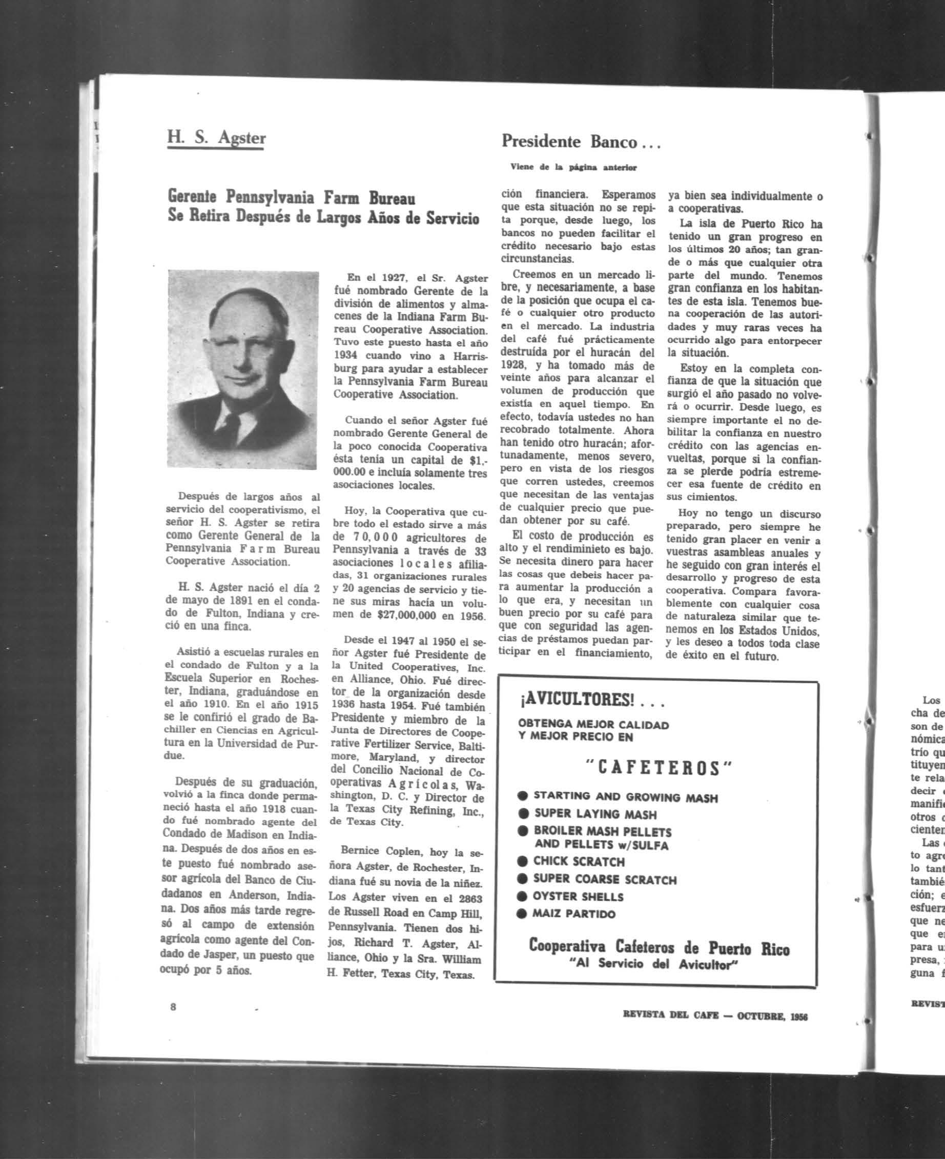 Después de largos años al servicio del cooperativismo, el señor H. S. Agster se retira como Gerente General de la Pennsylvania Farm Bureau Cooperative Association.