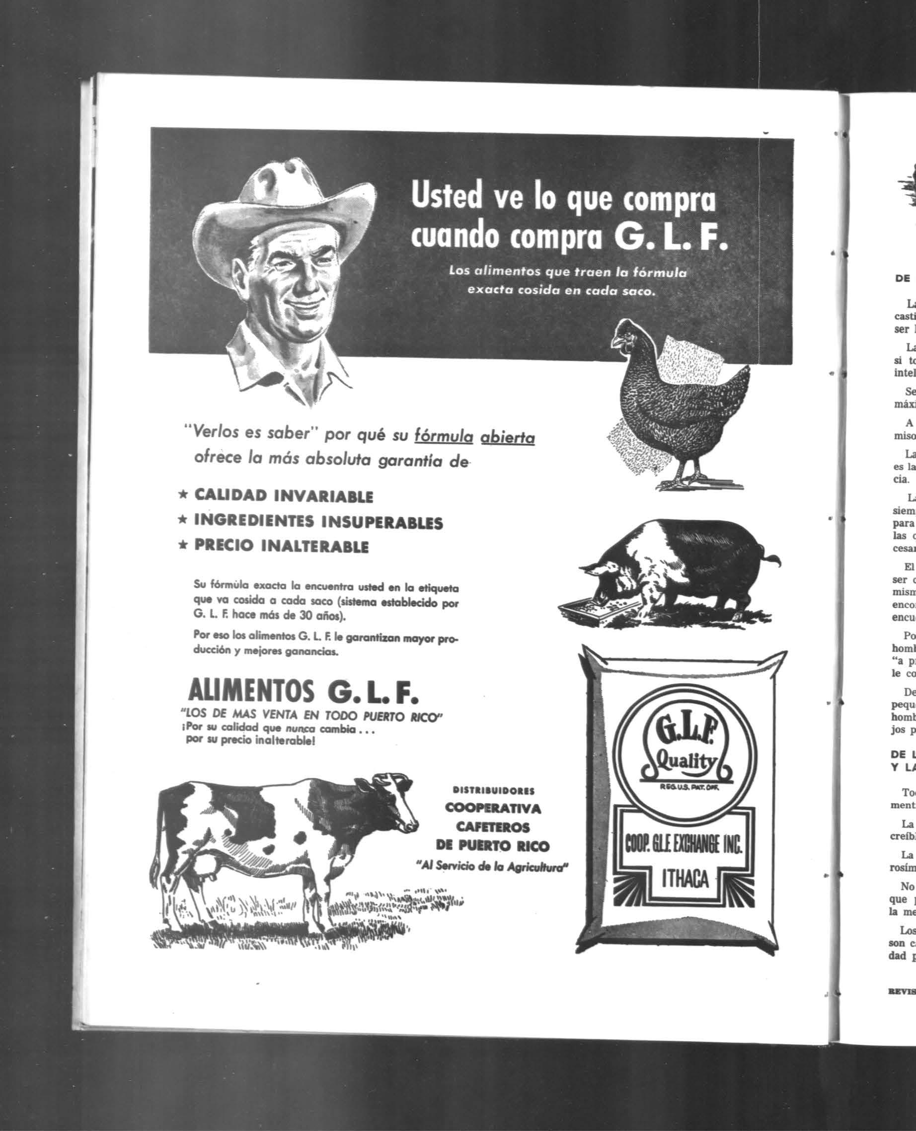 STARTING AND GROWING MASH O SUPER LAYING MASH O BROILER MASH PELLETS AND PELLETS w/SULFA O SUPER COARSE SCRATCH Cooperativa Cafeteros de Puerto Rico Al Servicio del Avicultor REVISTA DEL CAFE OCTUBRE,1956