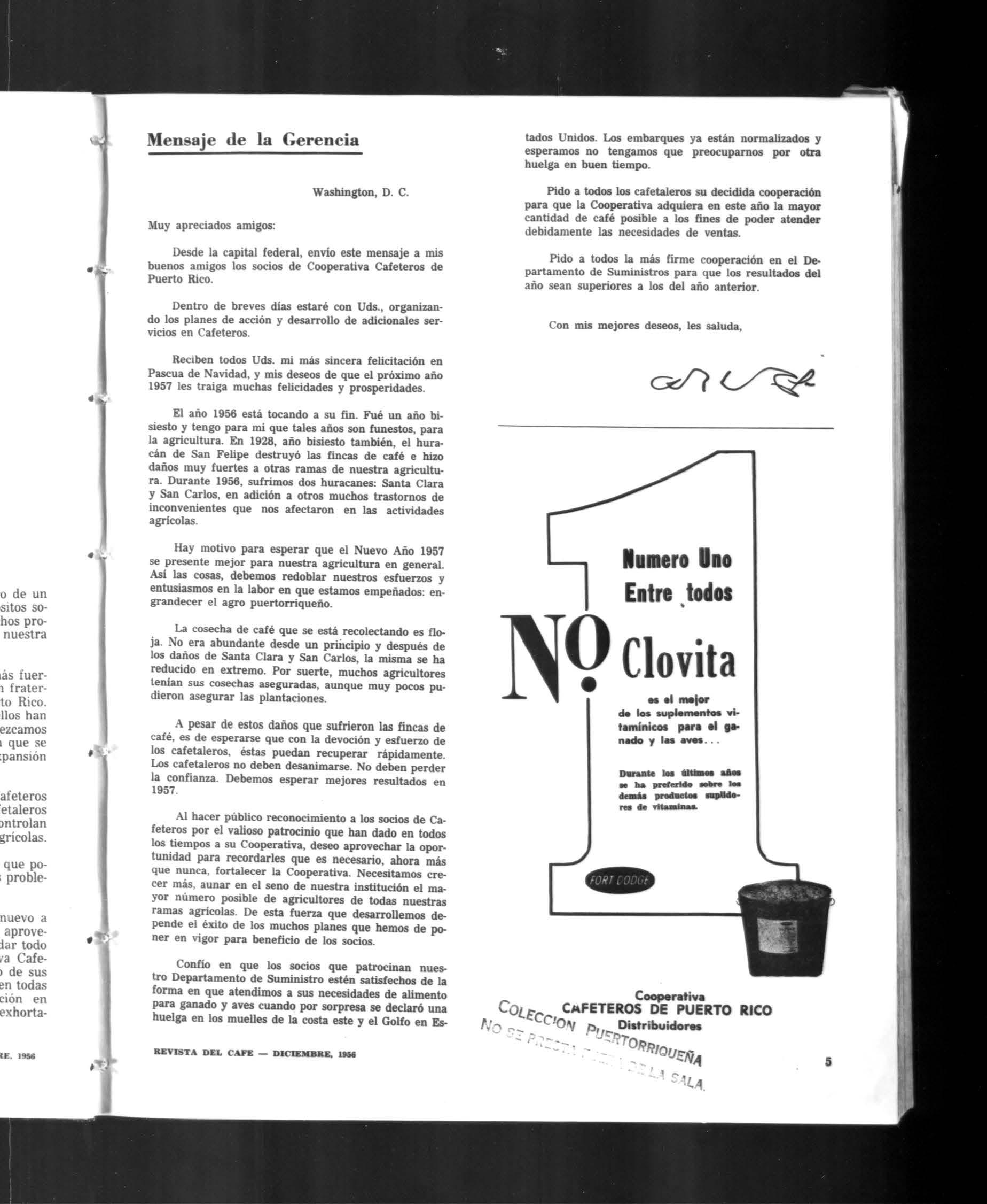 Al desear muchas felicidades en el año nuevo a todos los agricultores, REVISTA DEL CAFE aprovecha la oportunidad para exhortales a todos a dar todo su entusiasmo y cooperación a su Cooperativa Cafe- teros de Puerto Rico. El calor del entusiasmo de sus socios hace esperar a Cafeteros un mejor año en todas sus actividades. ¡Unión y decidida cooperación en 1957! Este es nuestro lema. Esta es nuestra exhortacion.