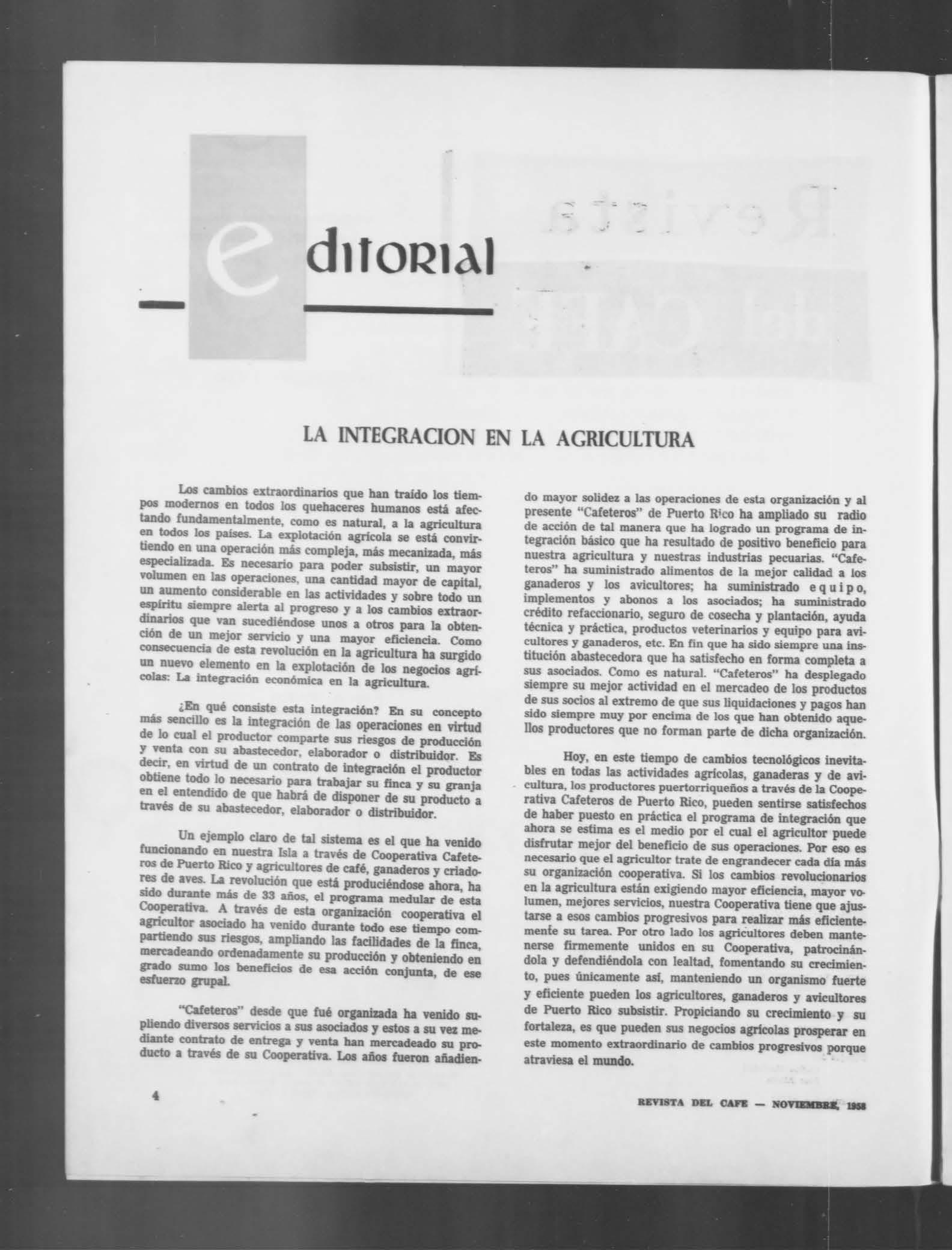 Hoy, en este tiempo de cambios tecnológicos inevita- bles en todas las actividades agrícolas, ganaderas y de avi- cultura, los productores puertorriqueños a través de la Coope- rativa Cafeteros de Puerto Rico, pueden sentirse satisfechos de haber puesto en práctica el programa de integración que ahora se estima es el medio por el cual el agricultor puede disfrutar mejor del beneficio de sus operaciones. Por eso es necesario que el agricultor trate de engrandecer cada día más su organización cooperativa. Si los cambios revolucionarios en la agricultura están exigiendo mayor eficiencia, mayor vo- lumen, mejores servicios, nuestra Cooperativa tiene que ajus- tarse a esos cambios progresivos para realizar más eficiente- mente su tarea. Por otro lado los agricultores deben mante- nerse firmemente unidos en su Cooperativa, patrocinán- dola y defendiéndola con lealtad, fomentando su crecimiento, pues únicamente así, manteniendo un organismo fuerte y eficiente pueden los agricultores, ganaderos y avicultores de Puerto Rico subsistir. Propiciando su crecimiento y su fortaleza, es que pueden sus negocios agrícolas prosperar en este momento extraordinario de cambios progresivos porque atraviesa el mundo.