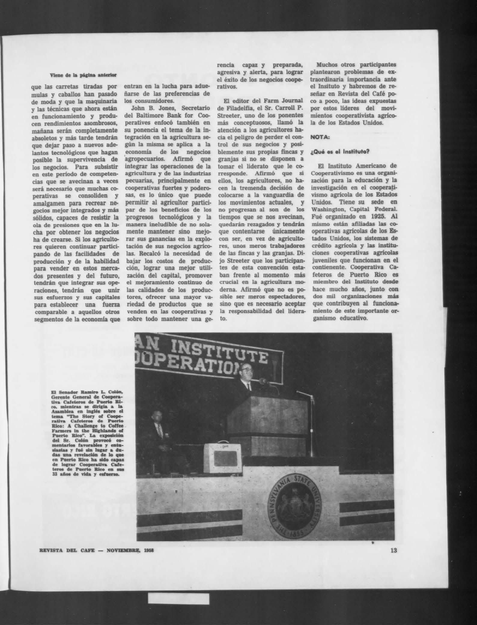Un ejemplo claro de tal sistema es el que ha venido funcionando en nuestra Isla a través de Cooperativa Cafete- ros de Puerto Rico y agricultores de café, ganaderos y criado- res de aves. La revolución que está produciéndose ahora, ha sido durante más de 33 años, el programa medular de esta Cooperativa. A través de esta organización cooperativa el agricultor asociado ha venido durante todo ese tiempo com- partiendo sus riesgos, ampliando las facilidades de la finca, mercadeando ordenadamente su producción y obteniendo en grado sumo los beneficios de esa acción conjunta, de ese esfuerzo grupal.