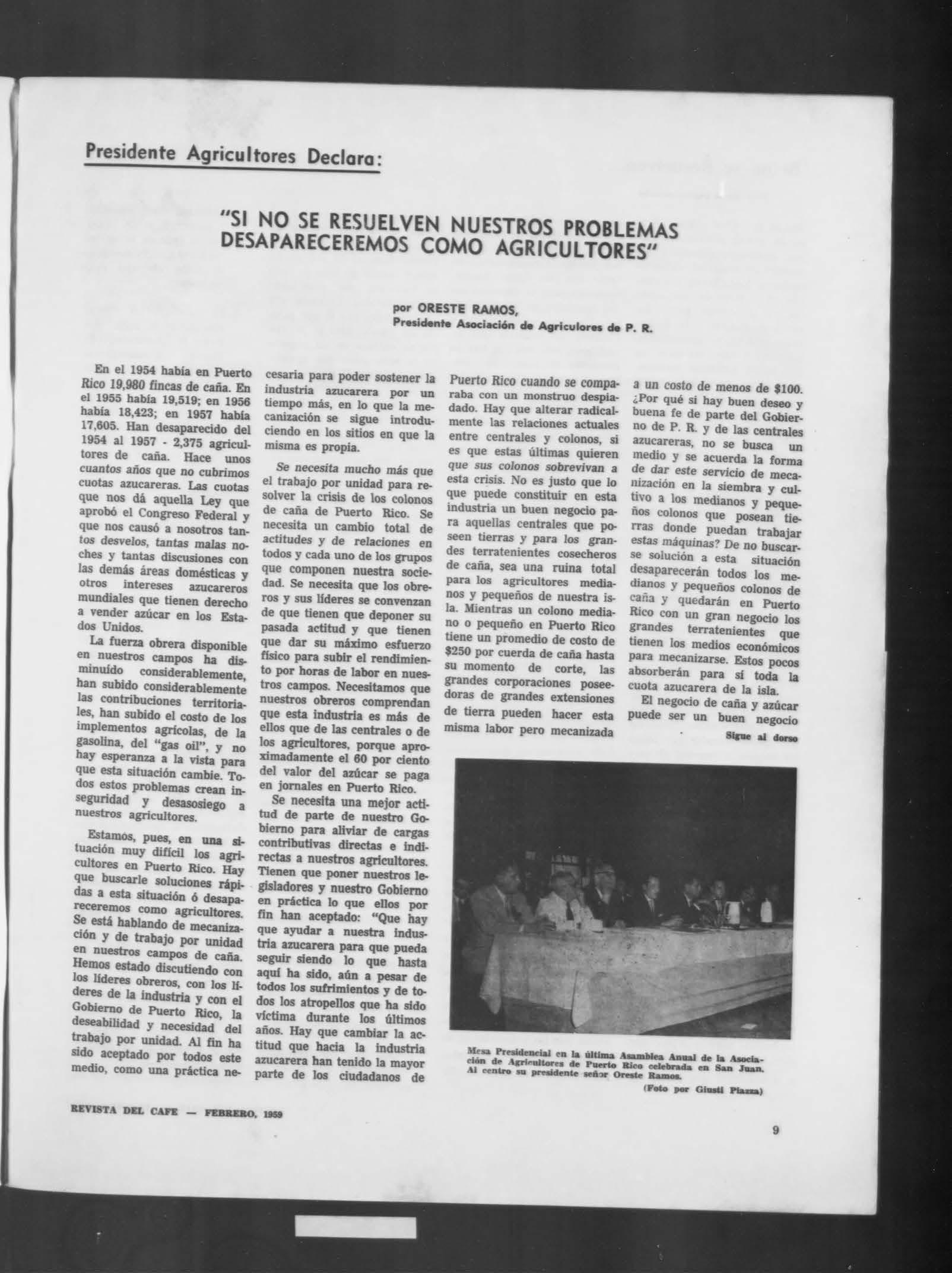 El panorama que presenta este problema es realmente angustioso para el agricultor puertorriqueño. No hay bra- zos para trabajar en nuestros cañaverales. No hay brazos para trabajar en la montaña cafetalera en donde si no fuera por las múltiples cabriolas que realiza el caficultor, para que no se le pierda la totalidad de su cosecha, ya hace tiempo que hubiera venido la ruina total de nuestra industria cafetalera. Ya cunde también el desasosiego en la ganadería, y en los proyectos avícolas. Los ganaderos y avicultores no consiguen los trabajadores necesarios para desarrollar sus proyectos en forma adecuada y progresista. Es decir, que ya el problema, con todas sus consecuencias tenebrosas, va alcanzando prácticamente todos los ángulos de nuestra producción agropecuaria.