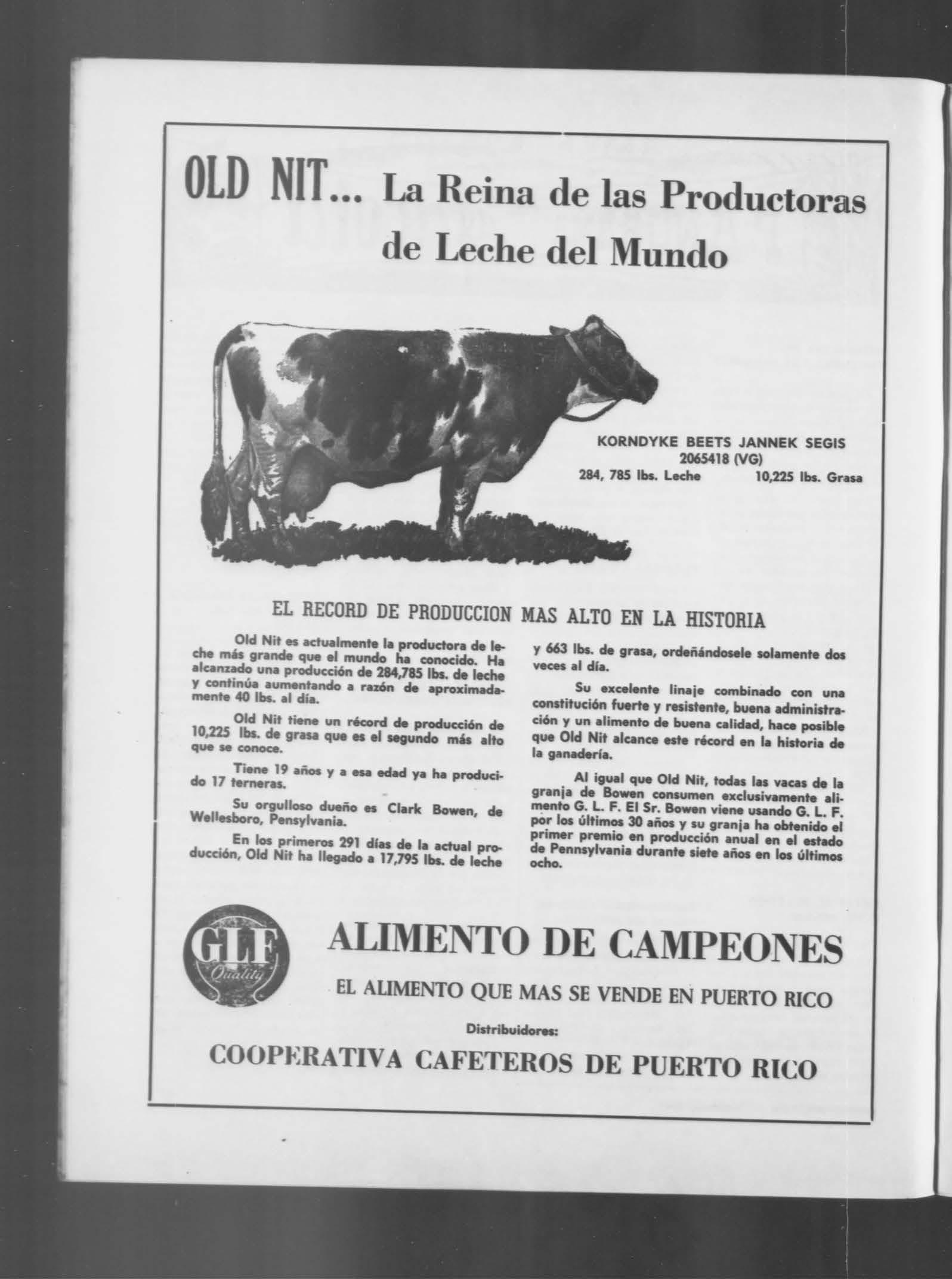 Dele a su vaca toda la yerba que quiera comer, más un alimento concentrado que contenga los nu- trimentos digestibles adicionales que necesita, y la vaca derramará en el balde toda la leche que es capaz de producir. Ese alimento es el GLF SUPER MILK MAKER servido únicamente por Cooperativa Cafeteros de Puerto Rico.