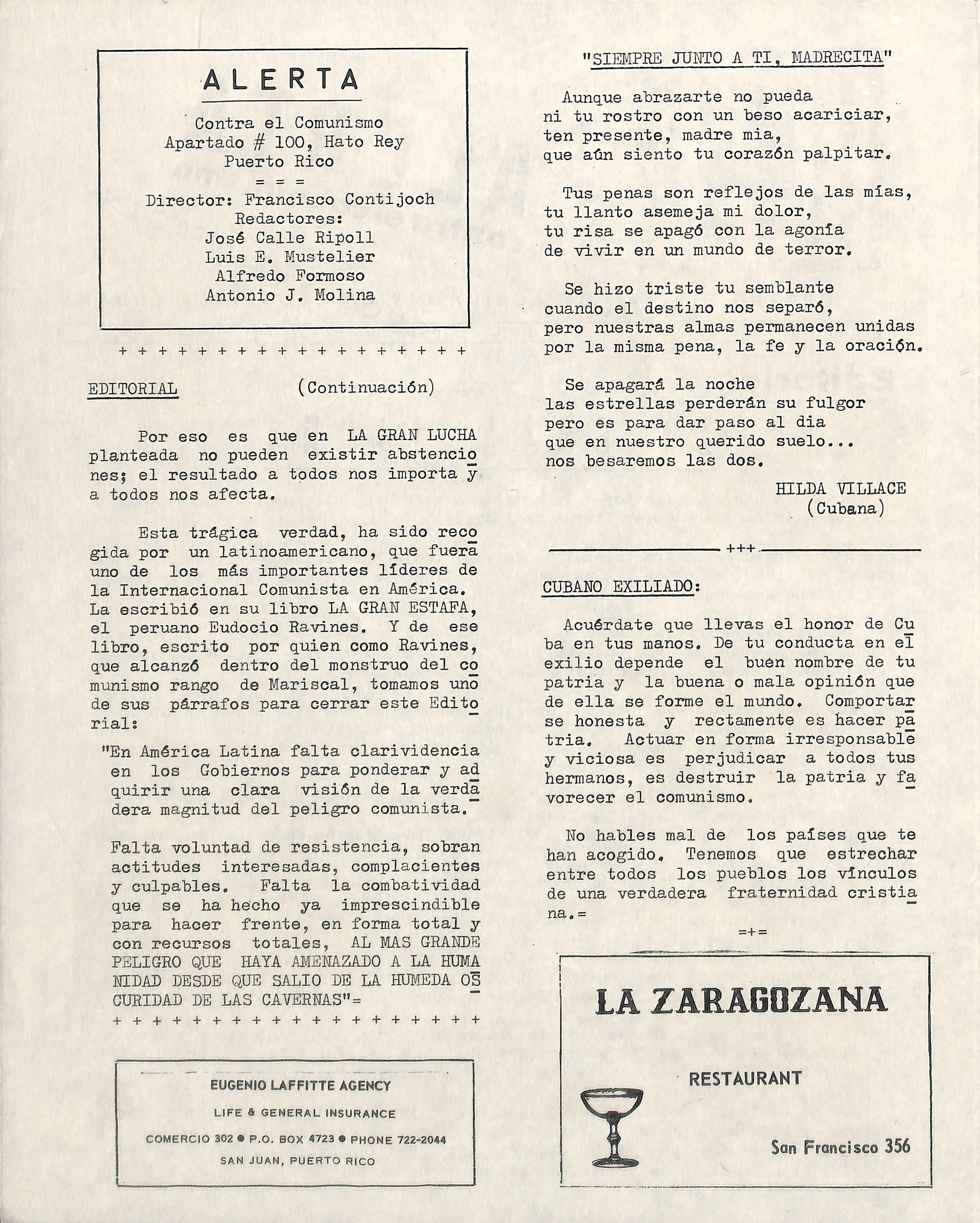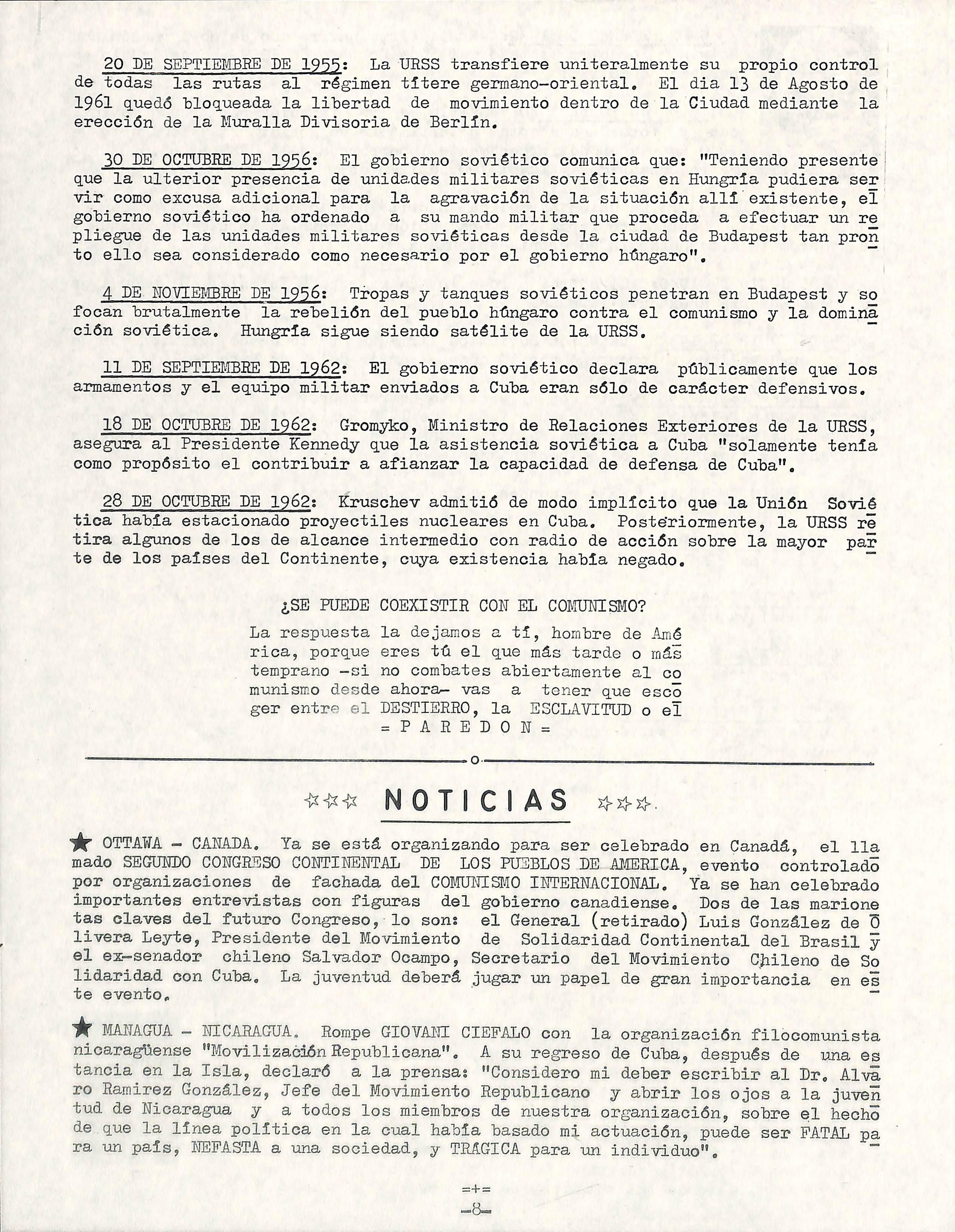 Este Boletín pues conlleva, como producto de nuestra propia tragedia y como reflejo fiel de la razón de ser de Acción Cívico-Económica Cubana, dos obje tivos: agrupar, en primer término, a todos los Cubanos de la Libre Empresa, hoy desalojados de la Patria, para así ayudar en el esfuerzo ingente e inelu dible de luchar por la liberación de nuestra Cuba; además, para ser el repi car constante sobre la conciencia adormecida de muchos de nuestros hermanos latinoamericanos, alertándolos contra el peligro real, inminente y desastro so del comunismo, de manera que ellos no caigan en el mismo trágico error en que nosotros los Cubanos hubimos de caer, por falta de una militancia activa en defensa de la libertad y de la democracia.