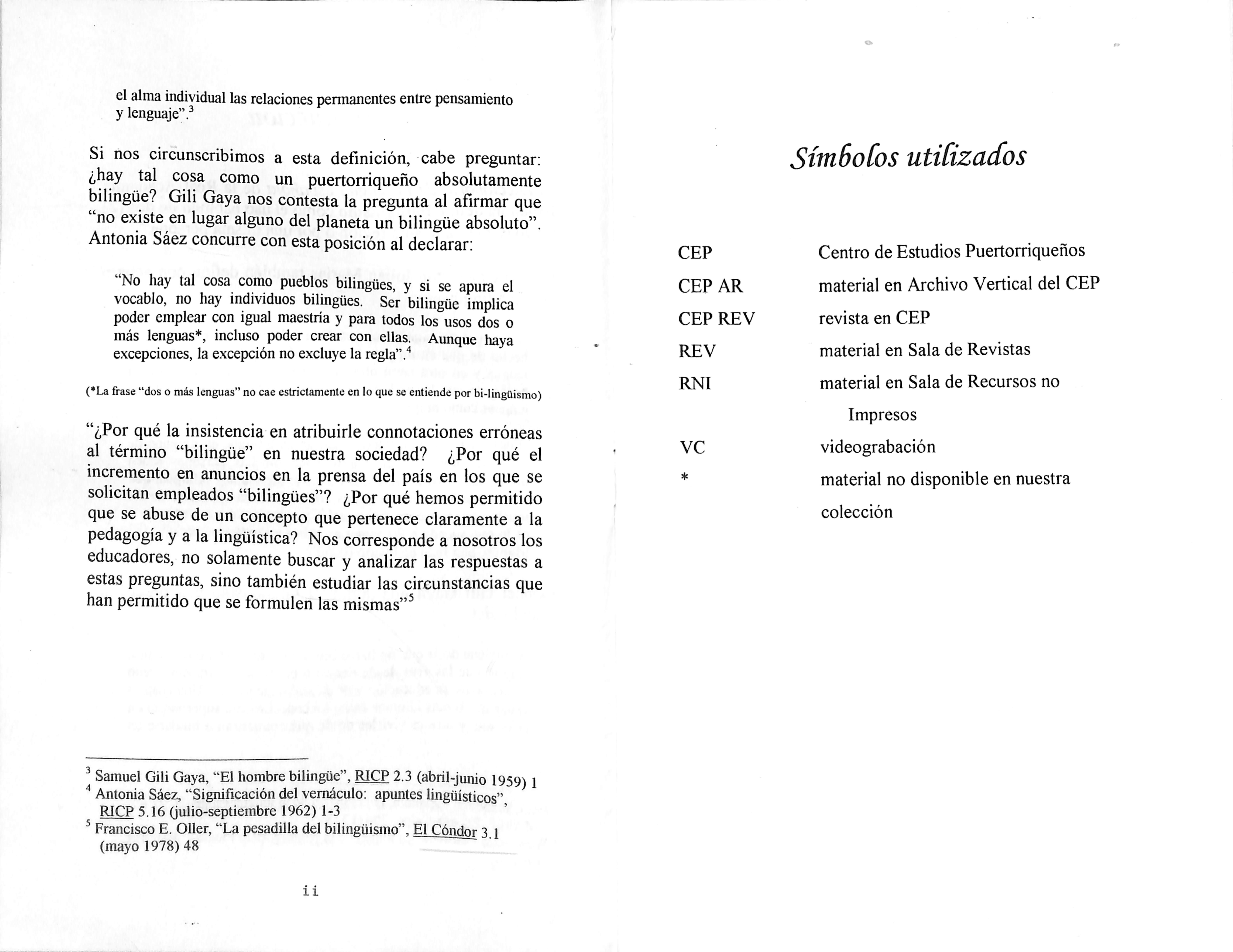 Cebollero, Pedro A. "The need for bilingualism". En: A school language policv for Puerto Rico. San Juan, Imprenta Baldrich, 1945, Reprint New York: Arno Press, 1975. 113. (CEP 371.98 C387p 1 1975)