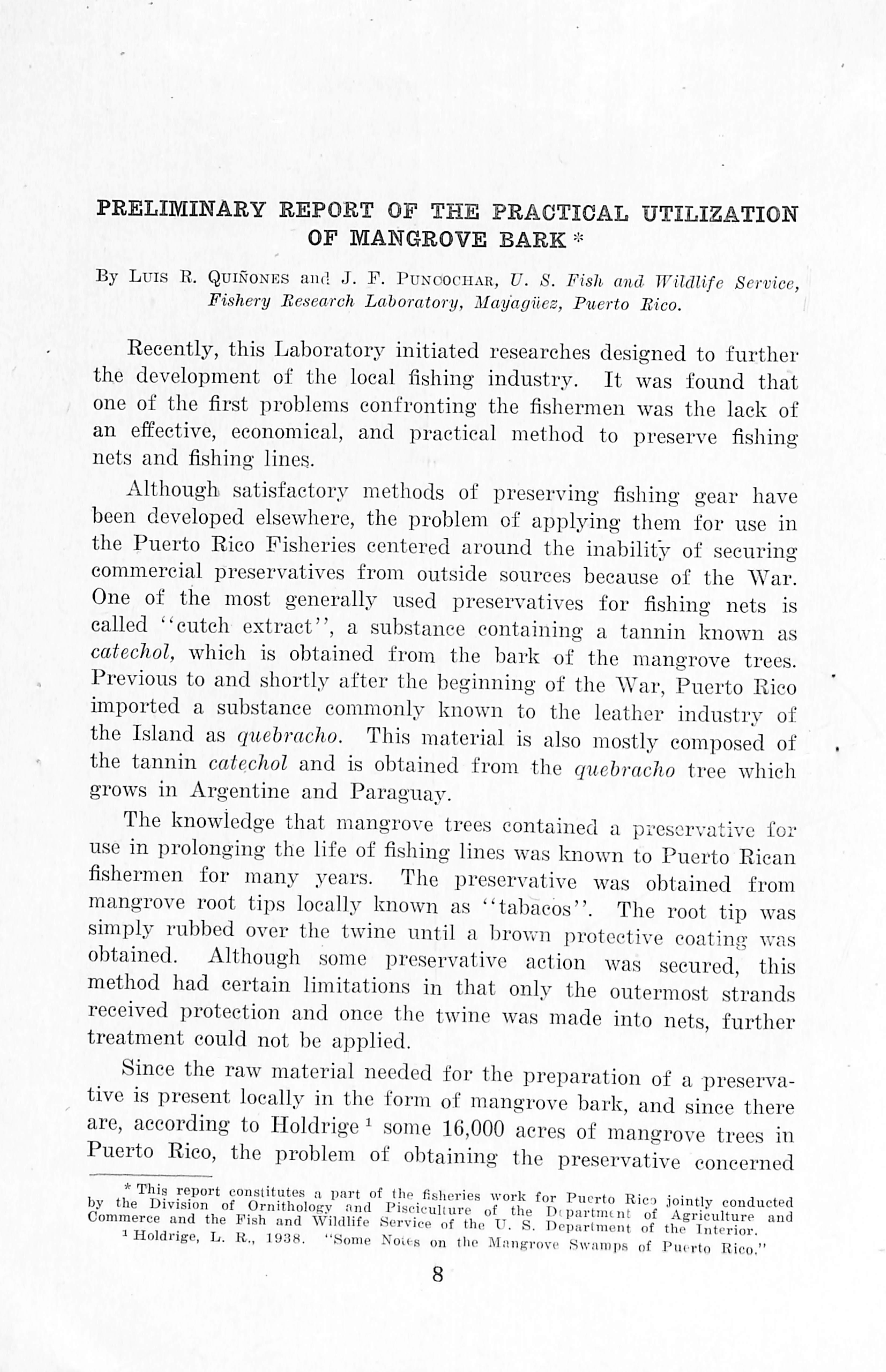 Although satisfactory methods of preserving fishing gear have been developed elsewhere, the problem of applying them for use in the Puerto Rico Pisheries centered around the inability of securing eommercial preservatives from outside sourees because of the War. One of the most generally used preservatives for fishing nets is called cutch extract , a substance containing a tannin known as catechol, which is obtained froin the bark of the mangrove trees. Previous to and shortly after the beginning of the War, Puerto Rico imported a substance eommonly known to the leather industry of the Island as quebracho. This material is also mostly composed of the tannin catechol and is obtained froin the quebracho ti'ee which grows in Argentine and Paraguay.
