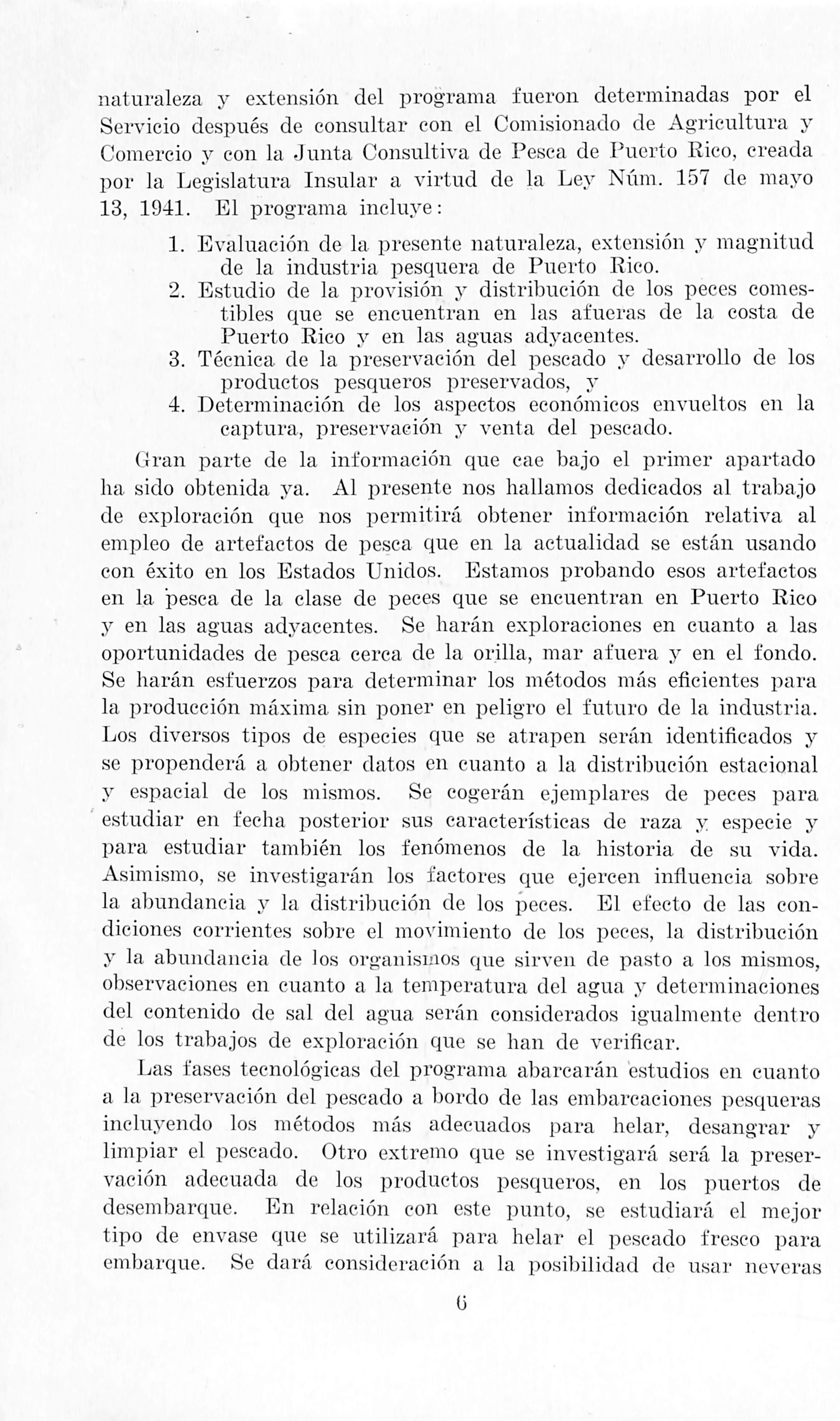Considerando que las cosechas agrícolas no bastan para suplir todas las necesidades de alimentos de los habitantes de Puerto Rico, el Departamento de Agricultura y Comercio, a través de su División de Ornitología y Piscicultura y con la cooperación del Servicio de Fauna Piscícola y Silvestre del Deparlamento del Interior Federal, está llevando a cabo estudios que tienden al desarrollo y fomento de la pesca comercial en Puerto Rico de modo tal que sea posible conseguir en el mar las proteínas animales, los minerales y las vita minas que tanto necesita la Isla para su dieta diaria. Con tal mira, la Asamblea Legislativa ordinaria del año 1941 asigno la cantidad de .$25,000 para que se llevasen a cabo estudios sobre la posibilidad de desarrollar en escala comercial la industria de la pesca en nuestra Isla.