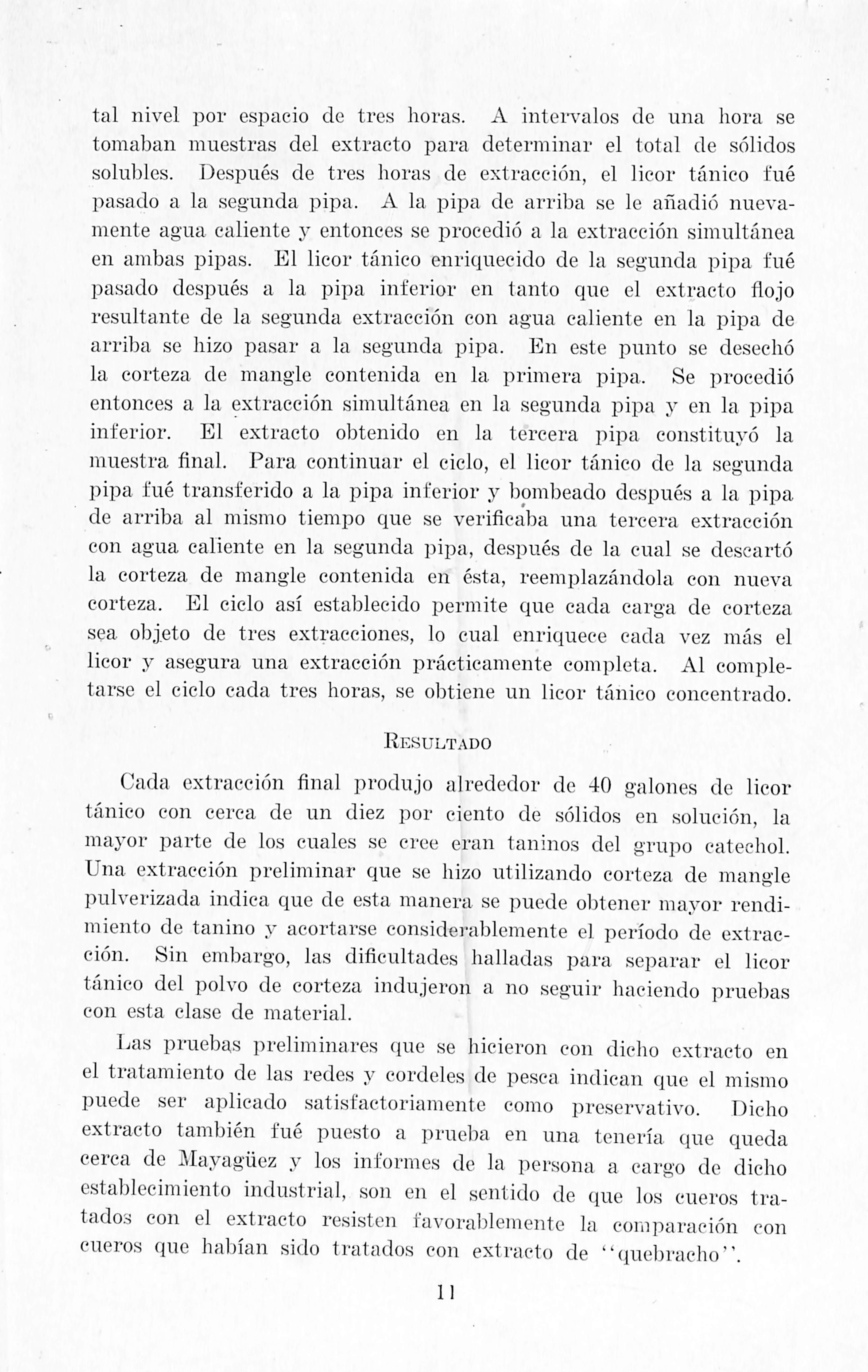 De los trabajos preliminares hasta ahora realizados se desprende que los extractos preparados con la corteza del mangle colorado pm' el método que se ha descrito, son satisfactorios para la preservación de las artes de pesca y para el curtido de cueros. La calidad del extracto acaso pueda ser mejorada mediante ulterior experimentación en lo que concierne a las temperaturas de extracción. Para el futuro próximo se proyecta trabajo adicional a este respecto. Se cree que la oxidación de los taninos podría ser disminuida sustancialmente mediante temperaturas más bajas. Tamliién habrá que determinai en ulteriores experimentoí^ el efecto de la temperatura sobre el rendi miento y sobre el color del extracto. Aún cuando se piensa seguii experimentando, se cree que la intormaeión ya obtenida es suíieionto para poder recomendar el método de extracción que se ha dejado descrito. Los dueños de tenerías informan que hay escasez de cueros debido a que no se puede importar "quebracho". Esto ha obligado a muchas tenerías a cerrar sus iiuertas. Plantas de mayor capacidad, del mismo tipo de la que se ha descrito, podrían construirse en cada tenería para obtener el-extracto necesario para las operaciones de la misma o posiblemente sería preferible establecer una planta central de extracción para suplir las necesidades de todas las tenerías. Esta planta podría suplir también el extracto (lue necesitan los pescadores para la preservación de sus artes de pesca.