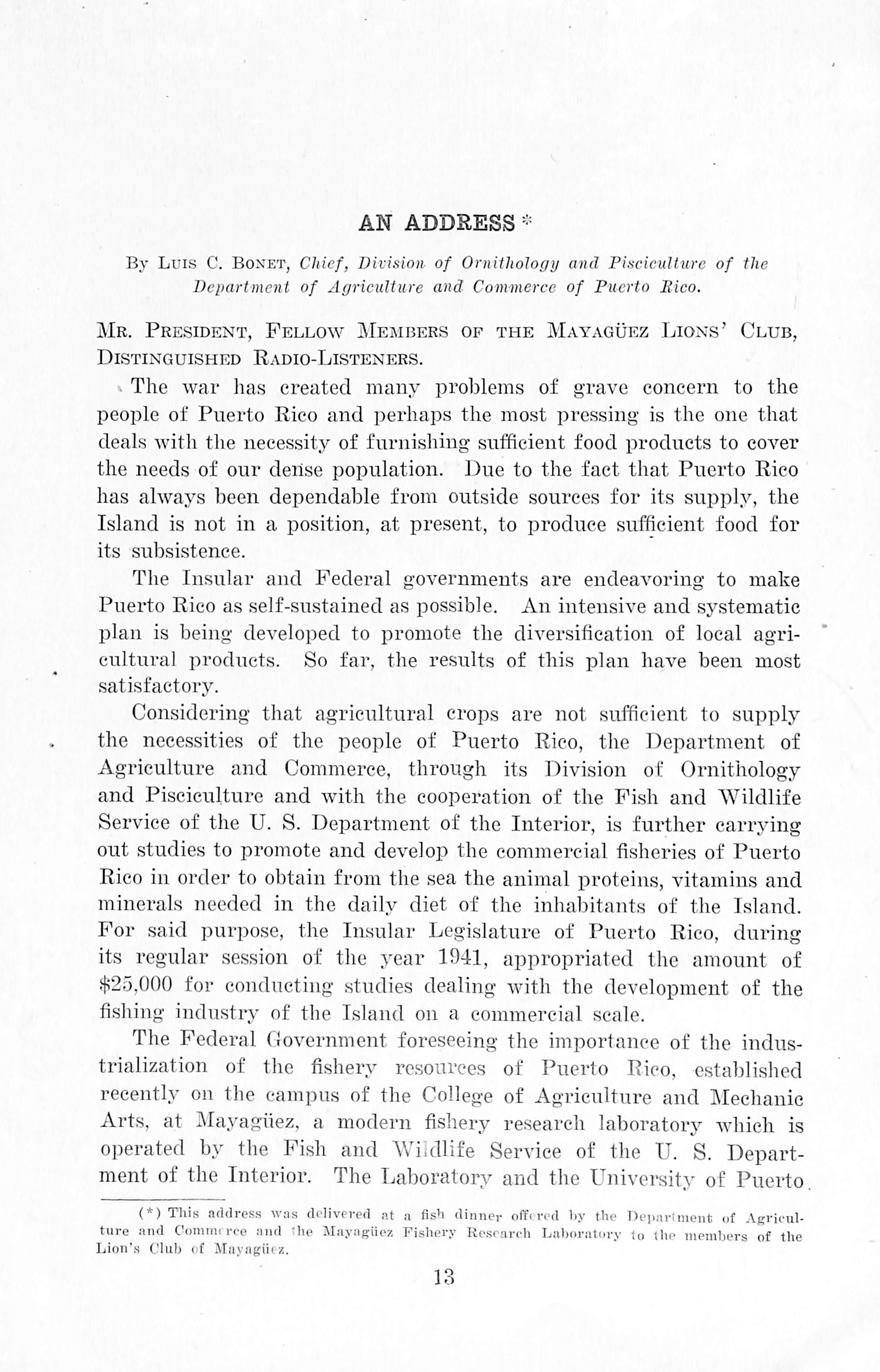 (*) Tliis addre.ss w.ts cldivered .at a fls'i diniun- offi nal Ijy the Depavlinont <it .VkvícuIture and Commi rt-e .and the Mayagüez Fishery Research Lalxiratory tu the members of the Lion's Club of Mayagíitz.