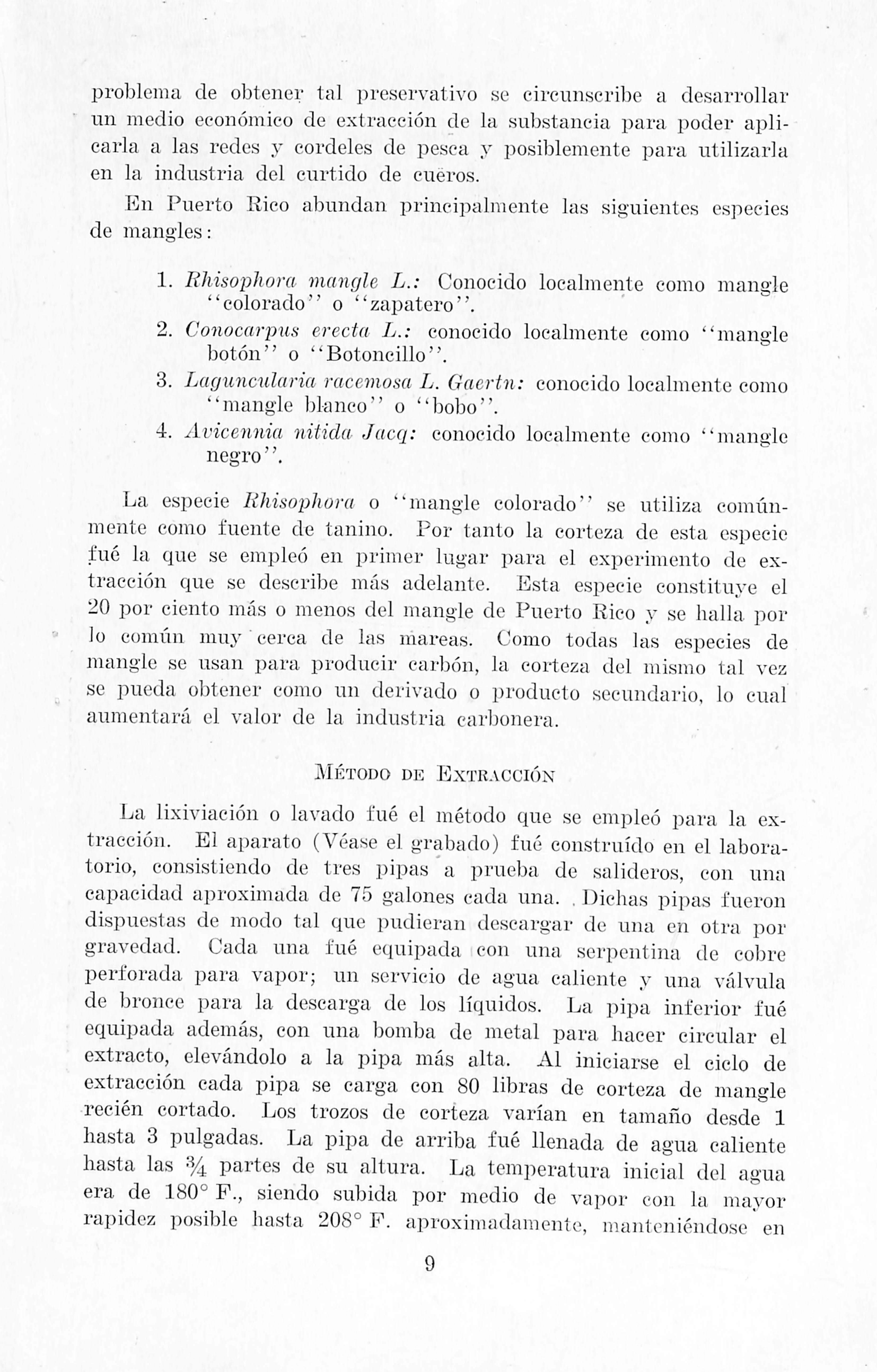 La especie liJúsophora o "mangle colorado" se utiliza común mente como fuente de tanino. Por tanto la corteza de esta especie fué la que se empleó en primer lugar para el experimento de ex tracción que se describe más adelante. Esta especie constituye el 20 por ciento más o menos del mangle de Puerto Rico y se halla, pol lo común muy cerca de las mareas. Como todas las especies de mangle se usan para producir carbón, la corteza del mismo tal vez se pueda obtener como un derivado o producto secundario, lo cual aumentará el valor de la industria carbonera.