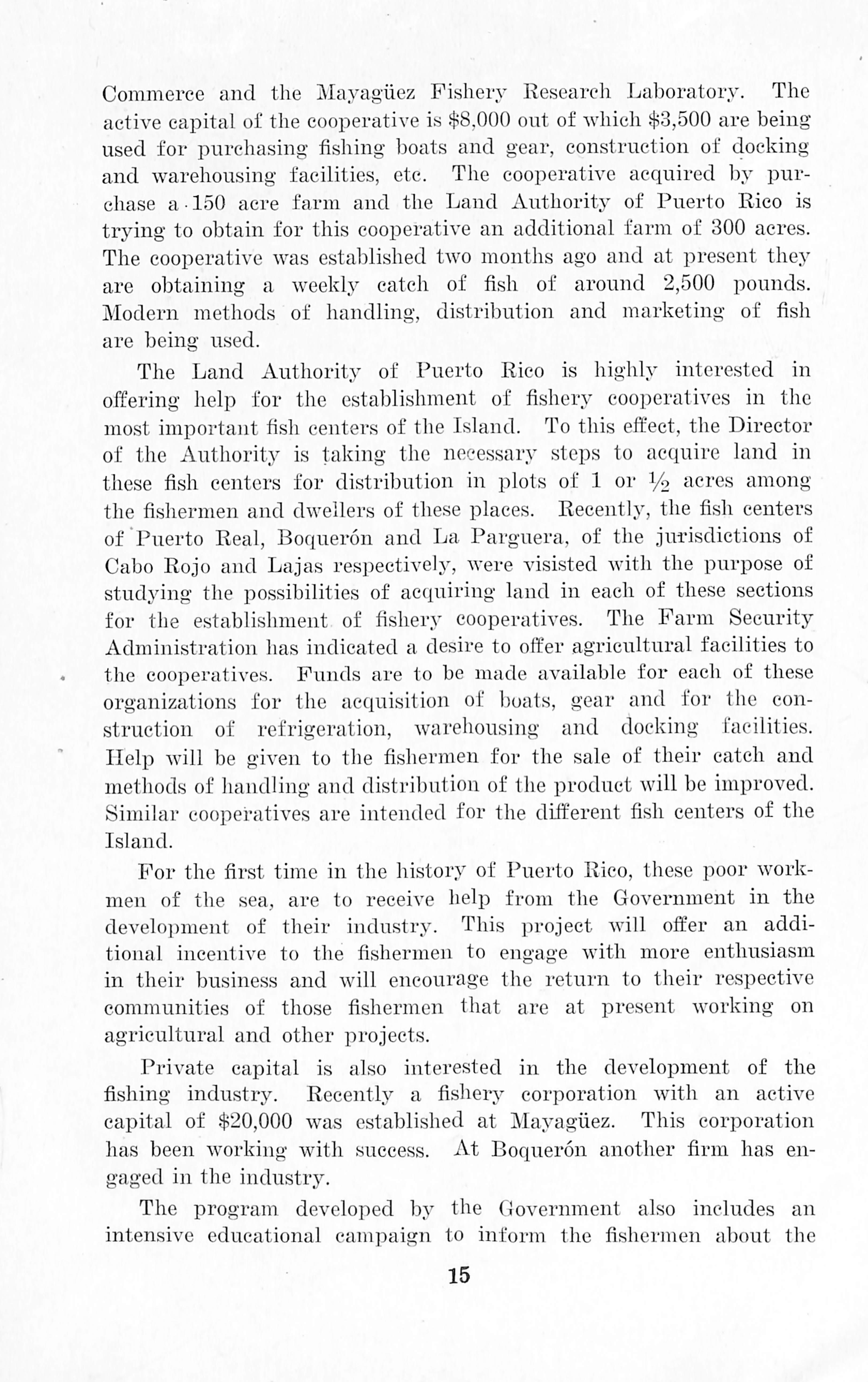 Con la cooperación de otras agencias federales e insulares estamos ayudando a establecer cooperativas de pescadores en varios puntos de la Isla. A dichas cooperativas se han hecho préstamos para la compra de embarcaciones y artefactos de pesca, así como para el mejoramiento de las facilidades con que se cuenta en los puertos. También están estudiándose planes para proporcionarles terreno a los pescadores, con el fin de mejorar las condiciones de vida en los centros pesqueros.