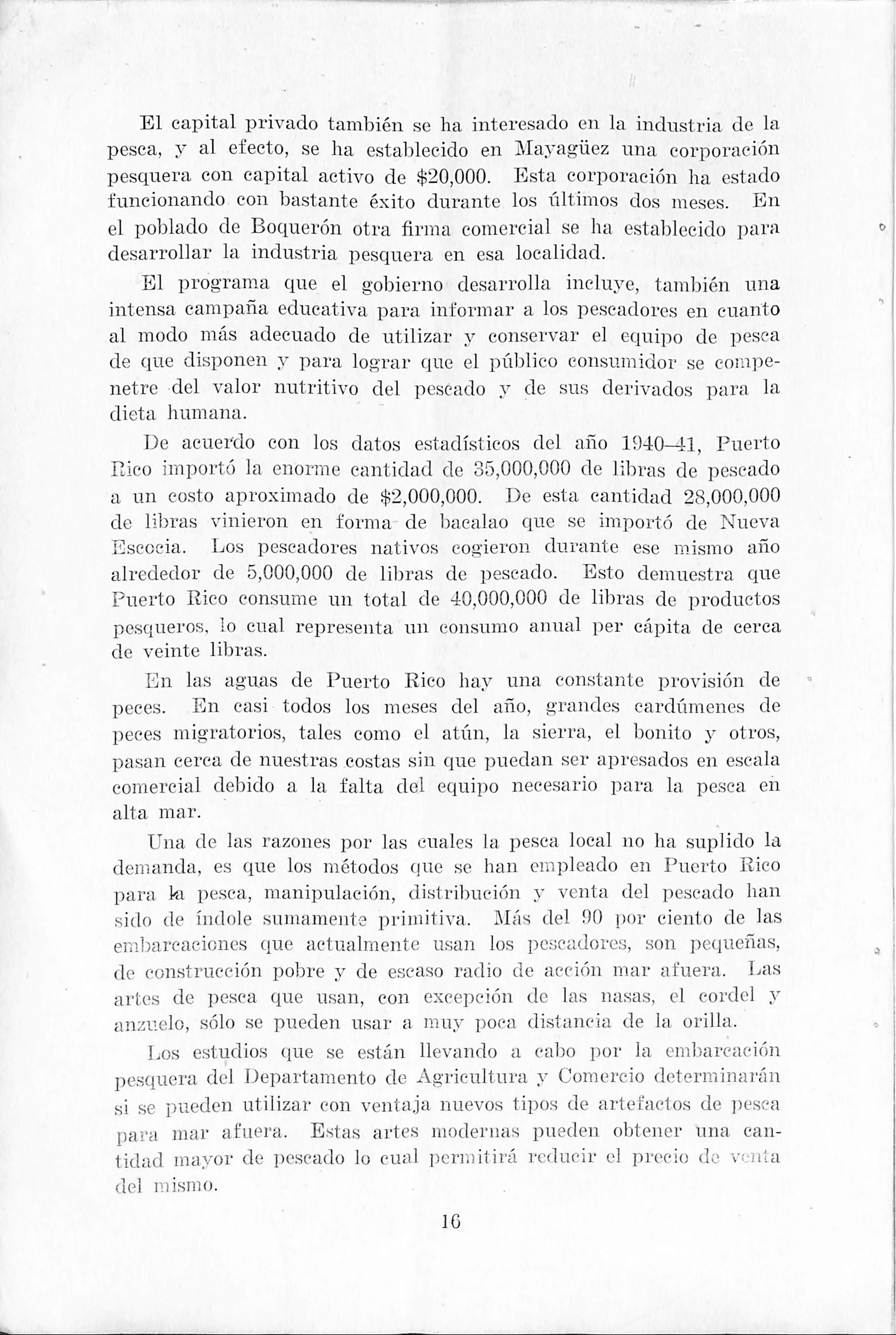El capital privado también se ha interesado en la industria de la pesca, y al efecto, se ha establecido en Mayagüez una corporación pesquera con capital activo de $20,000. Esta corporación ha estado funcionando con bastante éxito durante los últimos dos meses. En el poblado de Boquerón otra firma comercial se ha establecido para desarrollar la industria pesquera en esa localidad.